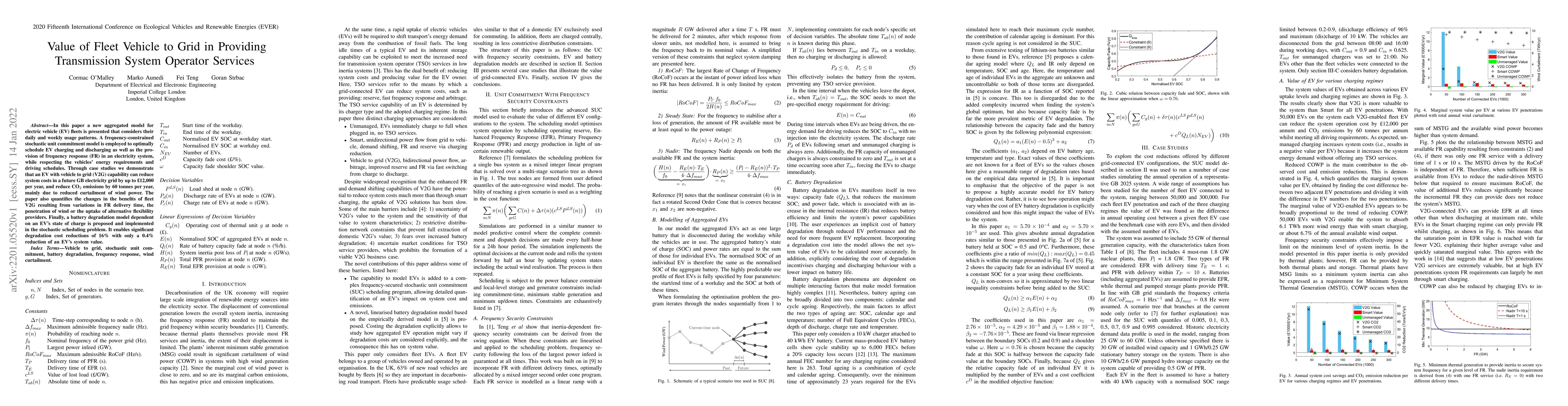 This paper develops an aggregated model for electric vehicle fleets to optimize charging/discharging and frequency response provision, showing that fleet vehicle-to-grid (V2G) capabilities can reduce system costs and CO2 emissions significantly. The study also introduces a battery degradation model to enhance cost-effectiveness while maintaining system value.