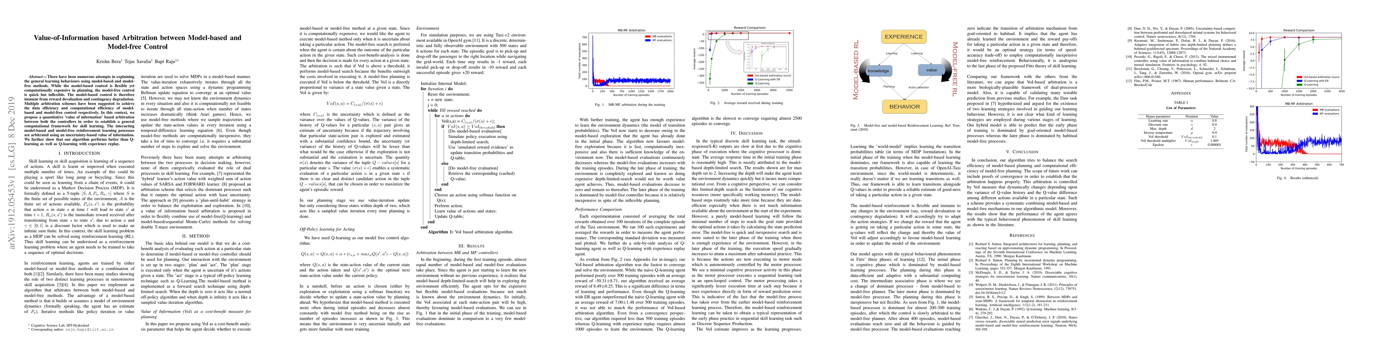 There have been numerous attempts in explaining the general learning behaviours using model-based and model-free methods. While the model-based control is flexible yet computationally expensive in planning, the model-free control is quick but inflexible. The model-based control is therefore immune from reward devaluation and contingency degradation. Multiple arbitration schemes have been suggested to achieve the data efficiency and computational efficiency of model-based and model-free control respectively. In this context, we propose a quantitative 'value of information' based arbitration between both the controllers in order to establish a general computational framework for skill learning. The interacting model-based and model-free reinforcement learning processes are arbitrated using an uncertainty-based value of information. We further show that our algorithm performs better than Q-learning as well as Q-learning with experience replay.