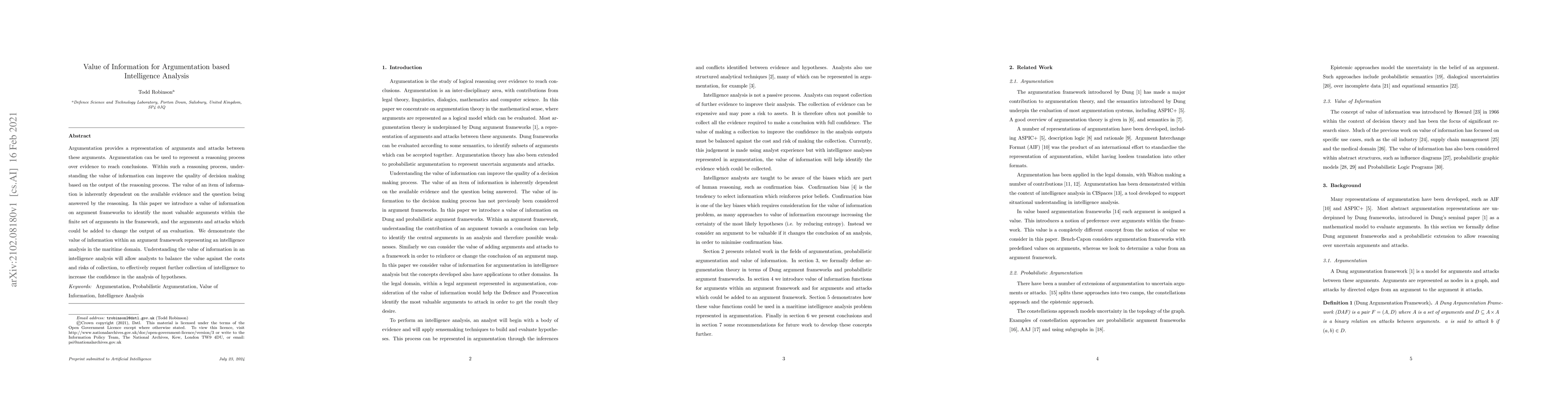 Argumentation provides a representation of arguments and attacks between these arguments. Argumentation can be used to represent a reasoning process over evidence to reach conclusions. Within such a reasoning process, understanding the value of information can improve the quality of decision making based on the output of the reasoning process. The value of an item of information is inherently dependent on the available evidence and the question being answered by the reasoning. In this paper we introduce a value of information on argument frameworks to identify the most valuable arguments within the finite set of arguments in the framework, and the arguments and attacks which could be added to change the output of an evaluation. We demonstrate the value of information within an argument framework representing an intelligence analysis in the maritime domain. Understanding the value of information in an intelligence analysis will allow analysts to balance the value against the costs and risks of collection, to effectively request further collection of intelligence to increase the confidence in the analysis of hypotheses.