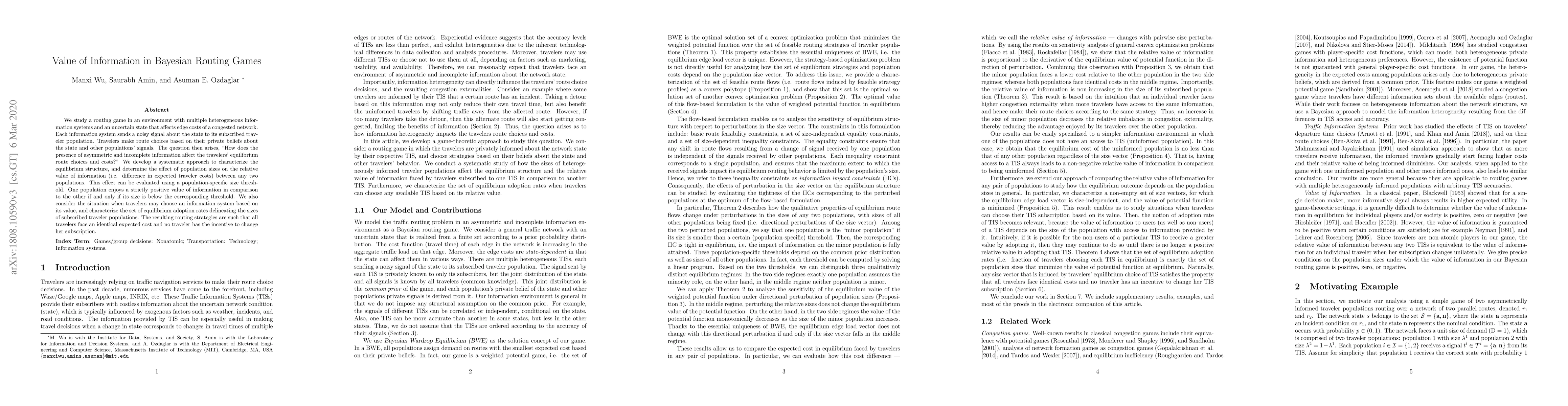 Researchers study how routing games with heterogeneous information systems and uncertain network conditions affect traveler route choices and costs. They find that the size of a population determines whether it has a "value of information" compared to others.