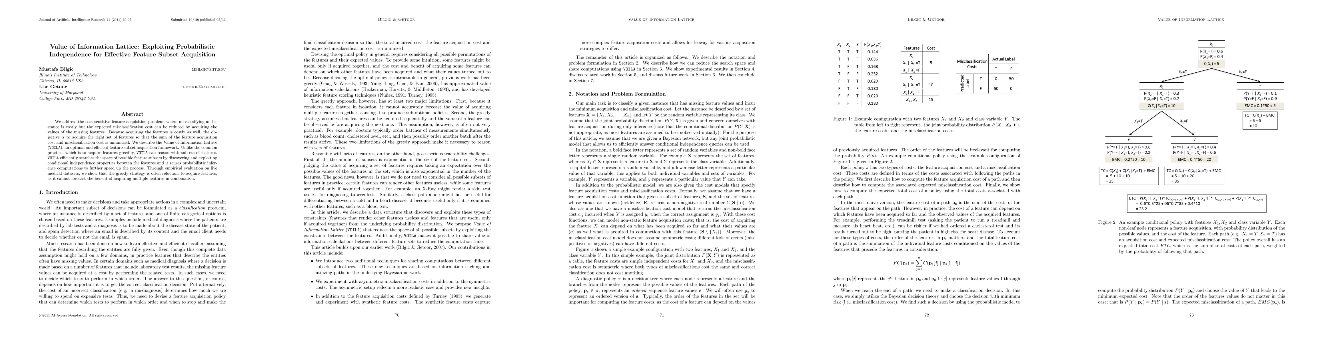 We address the cost-sensitive feature acquisition problem, where misclassifying an instance is costly but the expected misclassification cost can be reduced by acquiring the values of the missing features. Because acquiring the features is costly as well, the objective is to acquire the right set of features so that the sum of the feature acquisition cost and misclassification cost is minimized. We describe the Value of Information Lattice (VOILA), an optimal and efficient feature subset acquisition framework. Unlike the common practice, which is to acquire features greedily, VOILA can reason with subsets of features. VOILA efficiently searches the space of possible feature subsets by discovering and exploiting conditional independence properties between the features and it reuses probabilistic inference computations to further speed up the process. Through empirical evaluation on five medical datasets, we show that the greedy strategy is often reluctant to acquire features, as it cannot forecast the benefit of acquiring multiple features in combination.
