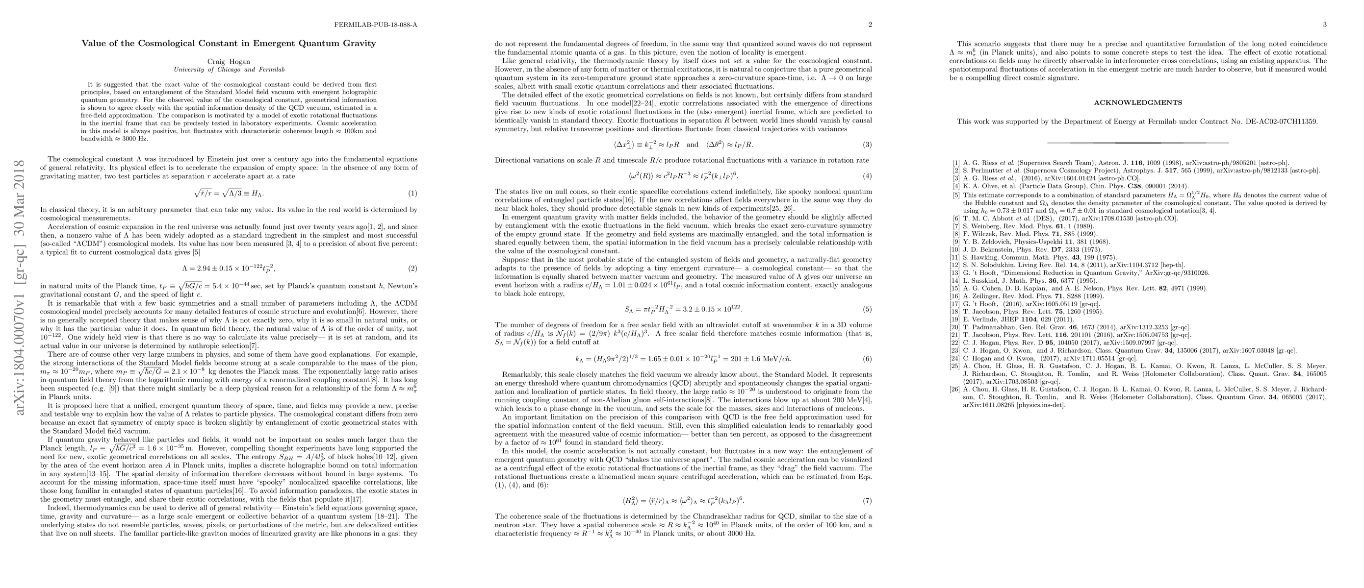 It is suggested that the exact value of the cosmological constant could be derived from first principles, based on entanglement of the Standard Model field vacuum with emergent holographic quantum geometry. For the observed value of the cosmological constant, geometrical information is shown to agree closely with the spatial information density of the QCD vacuum, estimated in a free-field approximation. The comparison is motivated by a model of exotic rotational fluctuations in the inertial frame that can be precisely tested in laboratory experiments. Cosmic acceleration in this model is always positive, but fluctuates with characteristic coherence length $\approx 100$km and bandwidth $\approx 3000$ Hz.