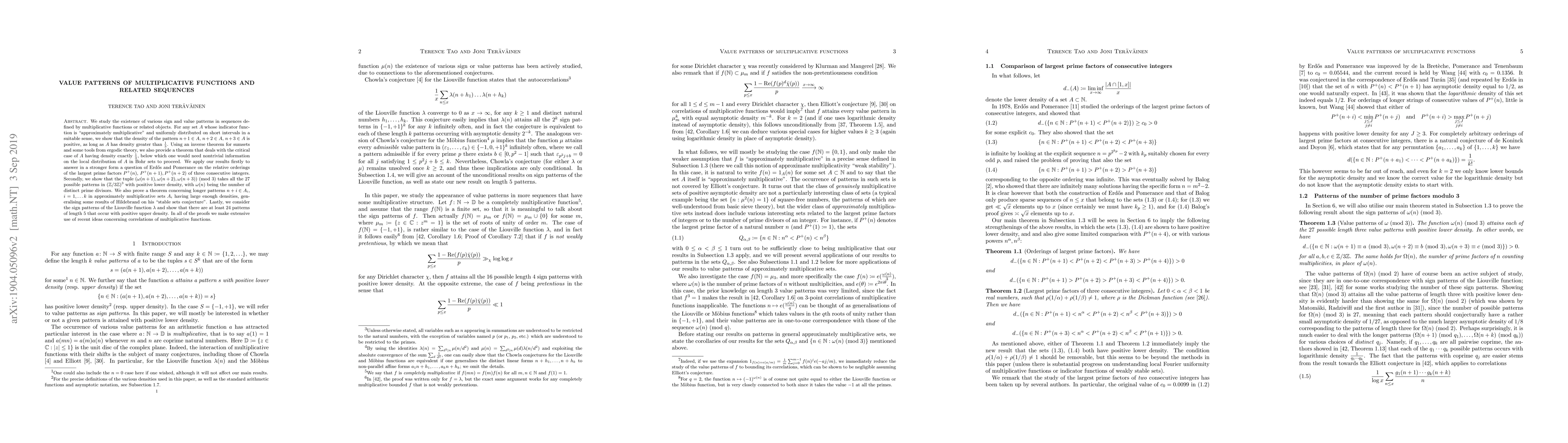 This paper investigates sign and value patterns in sequences generated by multiplicative functions, proving that certain patterns occur with positive density under specific conditions. It applies these results to sequences related to prime factors and the Liouville function, demonstrating the occurrence of various patterns with positive lower density.