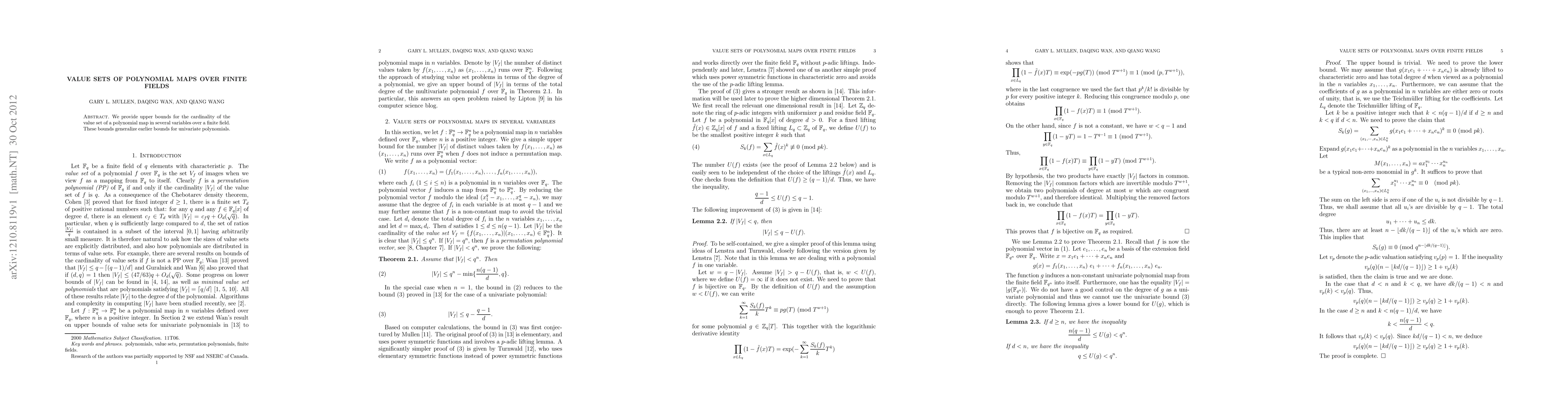 Summary: This paper establishes upper bounds for the cardinality of value sets of polynomial maps in multiple variables over finite fields, extending previous results for univariate polynomials. The findings provide a generalized framework for understanding polynomial behavior in finite fields.