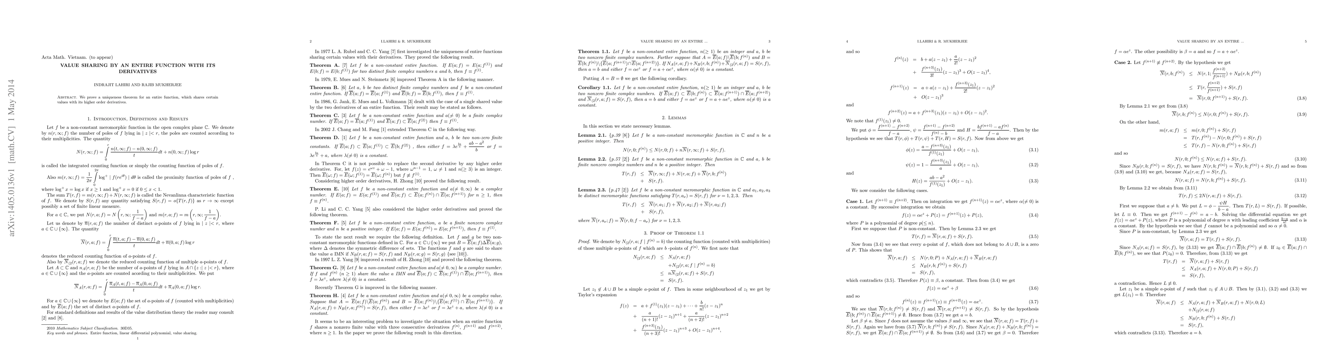 Summary: This paper establishes a uniqueness theorem for entire functions that share specific values with their higher-order derivatives, providing significant insights into the behavior and properties of such functions.