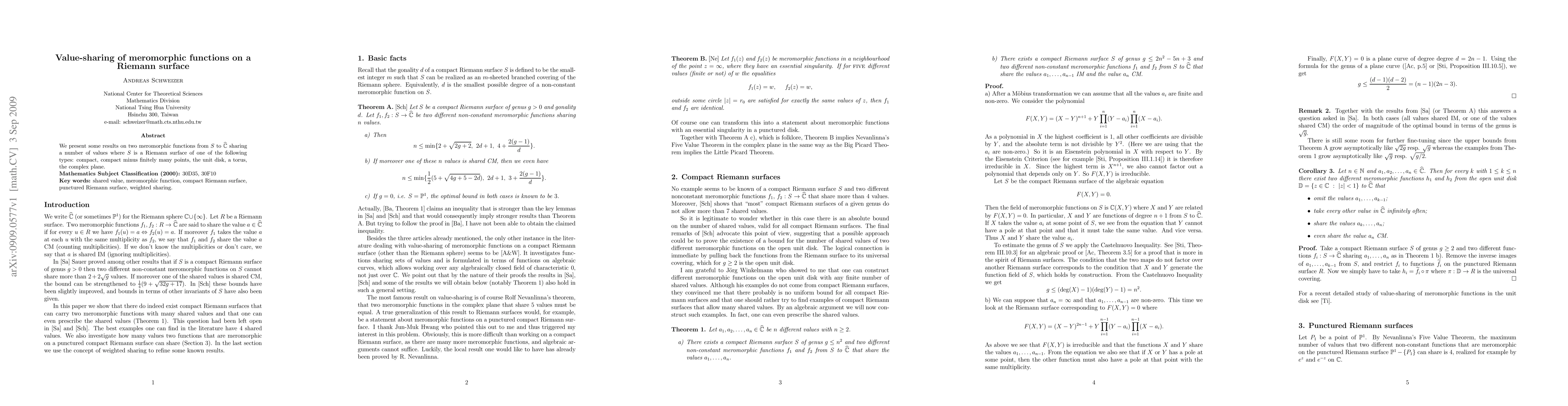 Summary: This research investigates the value-sharing properties of two meromorphic functions on various types of Riemann surfaces, including compact surfaces, punctured compact surfaces, the unit disk, tori, and the complex plane. It establishes conditions under which these functions share specific values.