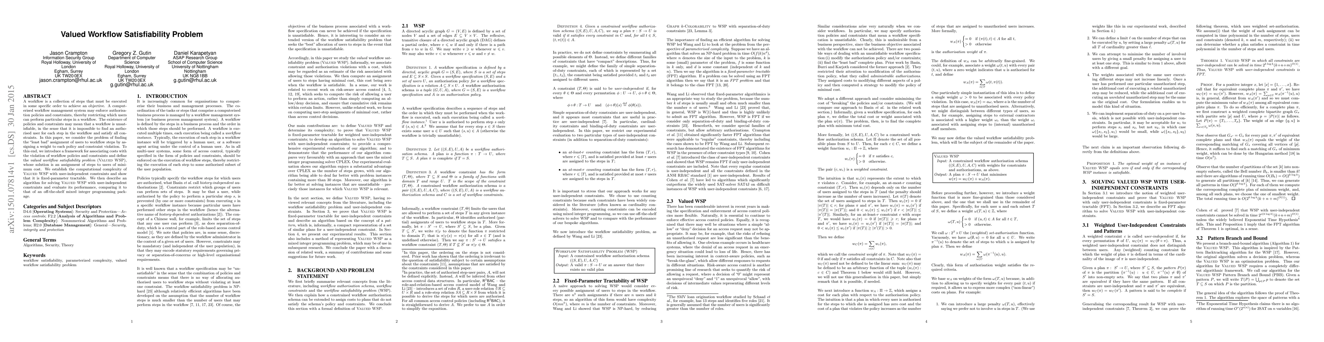 This paper introduces the valued workflow satisfiability problem (Valued WSP), which aims to find the least costly assignment of users to workflow steps under authorisation policies and constraints. It establishes the computational complexity and provides a fixed-parameter tractable algorithm for solving it, evaluating its performance against a mixed integer programming approach.