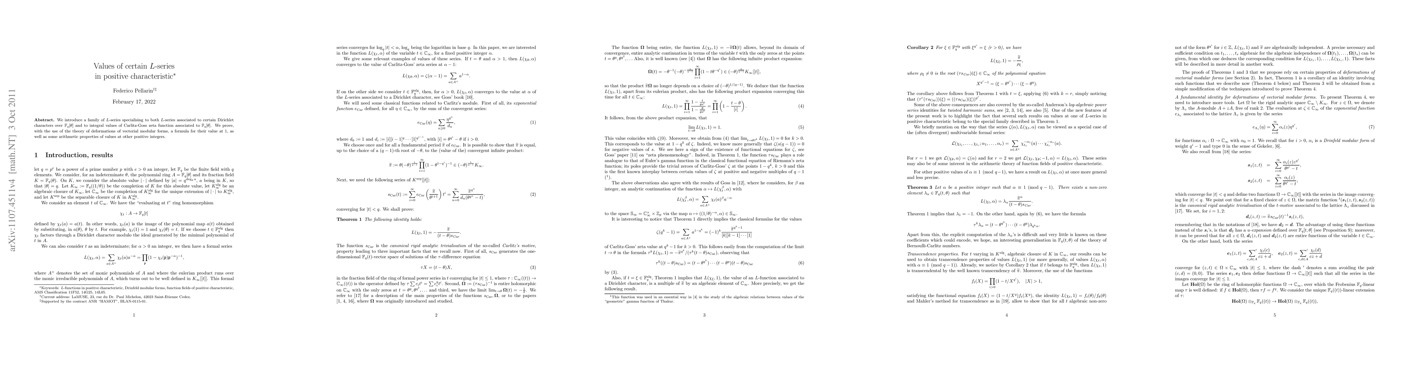 This paper explores a family of L-series linked to Dirichlet characters over F_q[T] and Carlitz-Goss zeta functions, proving their value at 1 using deformation theory and detailing additional arithmetic properties at positive integers.