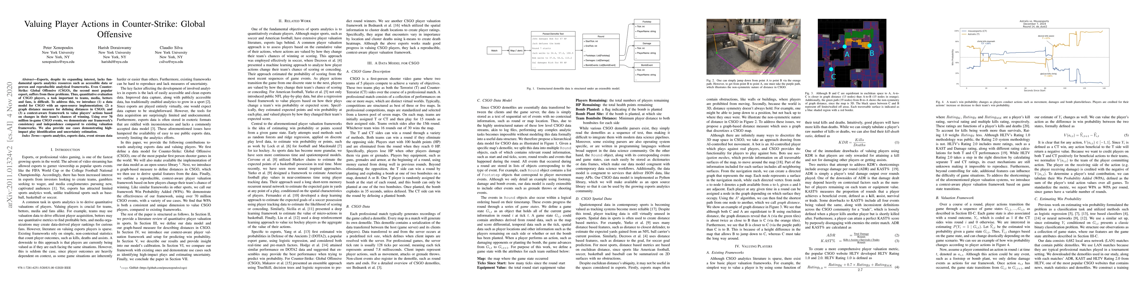Esports, despite its expanding interest, lacks fundamental sports analytics resources such as accessible data or proven and reproducible analytical frameworks. Even Counter-Strike: Global Offensive (CSGO), the second most popular esport, suffers from these problems. Thus, quantitative evaluation of CSGO players, a task important to teams, media, bettors and fans, is difficult. To address this, we introduce (1) a data model for CSGO with an open-source implementation; (2) a graph distance measure for defining distances in CSGO; and (3) a context-aware framework to value players' actions based on changes in their team's chances of winning. Using over 70 million in-game CSGO events, we demonstrate our framework's consistency and independence compared to existing valuation frameworks. We also provide use cases demonstrating high-impact play identification and uncertainty estimation.
