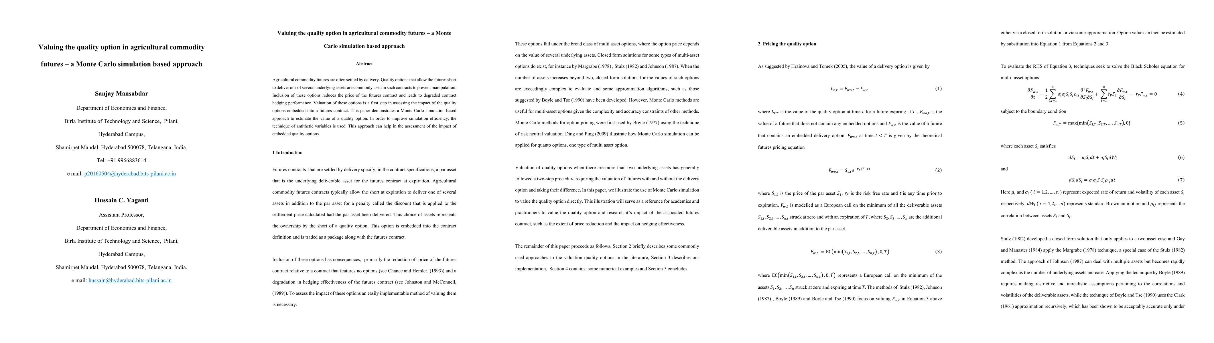 This paper proposes a Monte Carlo simulation method to estimate the value of quality options in agricultural commodity futures, using antithetic variables to enhance efficiency. The valuation helps assess the impact of these options on futures contract pricing and hedging performance.