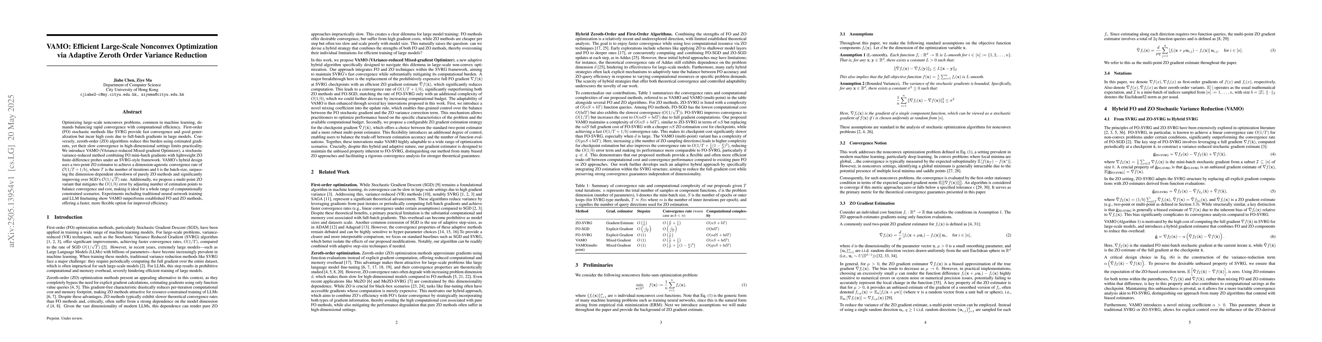 This research presents a novel optimization method, VAMO, which efficiently tackles large-scale nonconvex problems in machine learning by reducing computational burden while maintaining fast convergence, crucial for practical applications in training traditional neural networks and fine-tuning large language models.