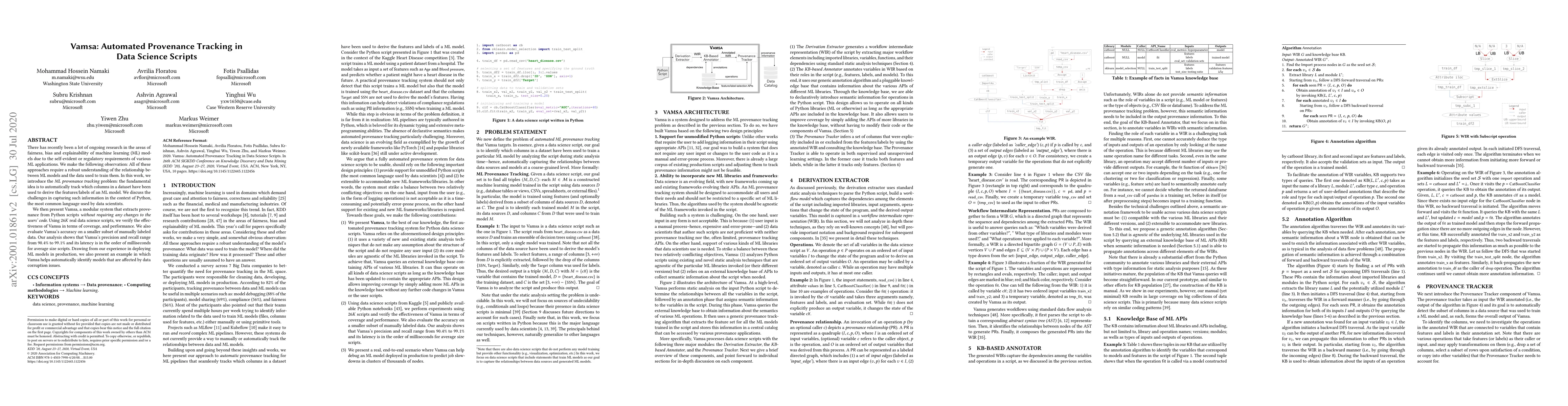 Vamsa is a system designed to automatically track provenance in data science scripts, identifying which dataset columns are used to derive features/labels for ML models. It achieves this without altering users' code, demonstrating high precision and recall, and minimal latency.