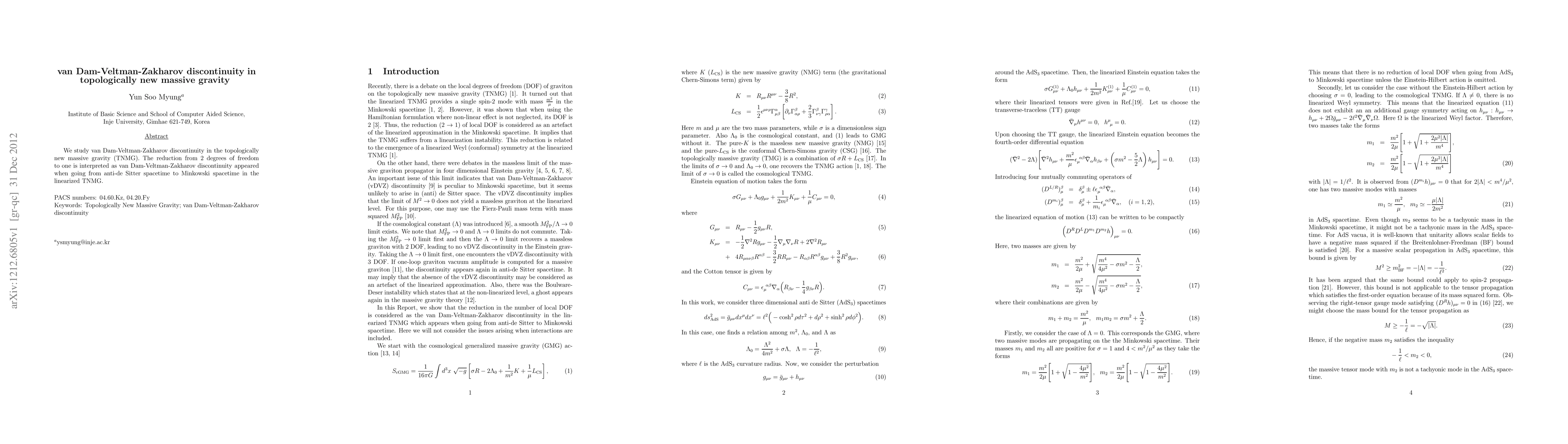 We study van Dam-Veltman-Zakharov discontinuity in the topologically new massive gravity (TNMG). The reduction from 2 degrees of freedom to one is interpreted as van Dam-Veltman-Zakharov discontinuity appeared when going from anti-de Sitter spacetime to Minkowski spacetime in the linearized TNMG.