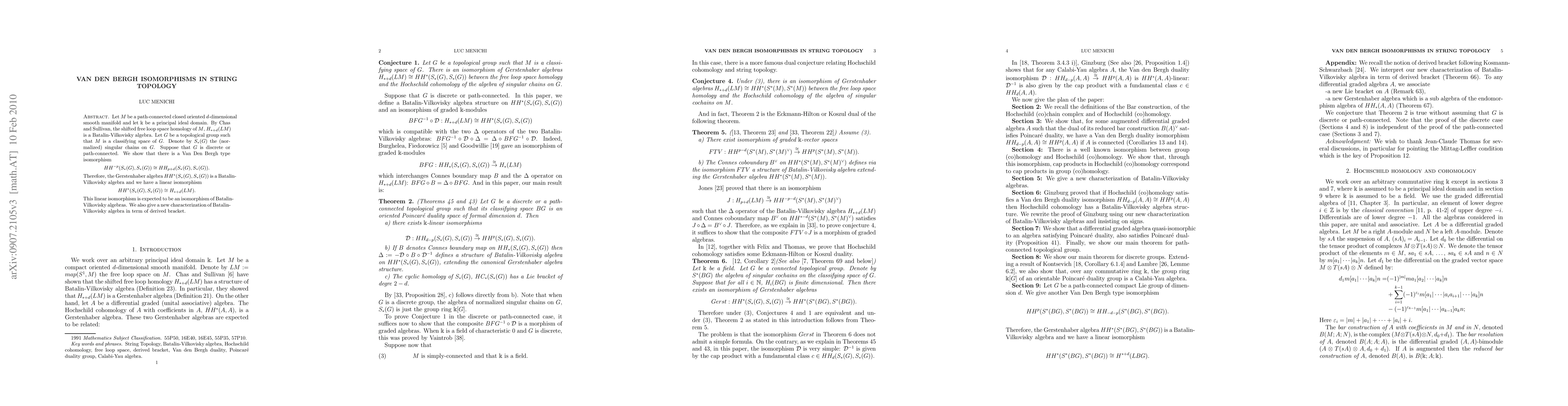 Let $M$ be a path-connected closed oriented $d$-dimensional smooth manifold and let ${\Bbbk}$ be a principal ideal domain. By Chas and Sullivan, the shifted free loop space homology of $M$, $H_{*+d}(LM)$ is a Batalin-Vilkovisky algebra. Let $G$ be a topological group such that $M$ is a classifying space of $G$. Denote by $S_*(G)$ the (normalized) singular chains on $G$. Suppose that $G$ is discrete or path-connected. We show that there is a Van Den Bergh type isomorphism $$ HH^{-p}(S_*(G),S_*(G))\cong HH_{p+d}(S_*(G),S_*(G)). $$ Therefore, the Gerstenhaber algebra $HH^{*}(S_*(G),S_*(G))$ is a Batalin-Vilkovisky algebra and we have a linear isomorphism $$HH^{*}(S_*(G),S_*(G))\cong H_{*+d}(LM).$$ This linear isomorphism is expected to be an isomorphism of Batalin-Vilkovisky algebras. We also give a new characterization of Batalin-Vilkovisky algebra in term of derived bracket.