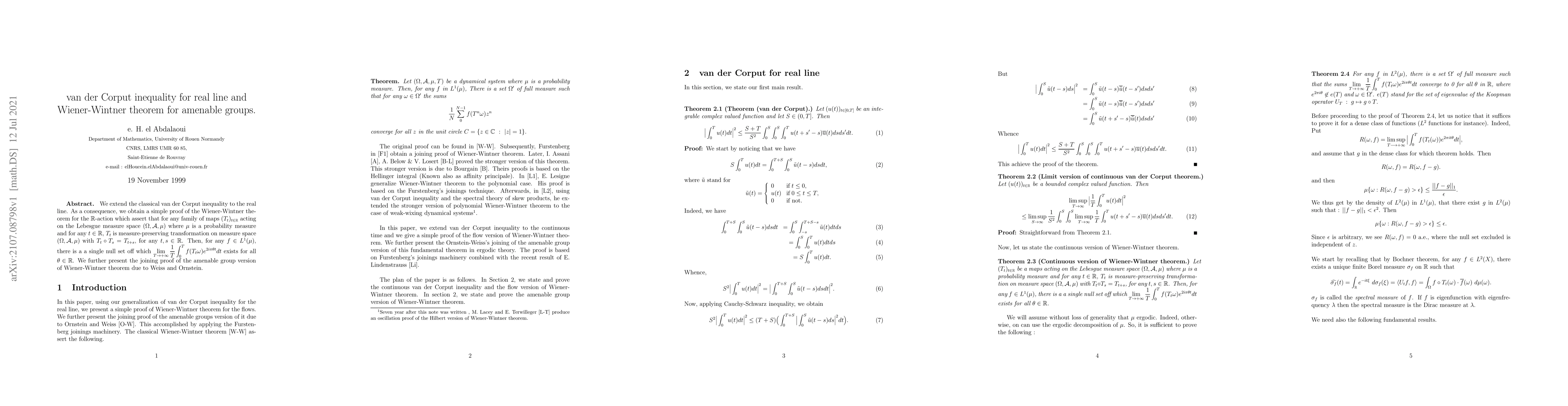 We extend the classical van der Corput inequality to the real line. As a consequence, we obtain a simple proof of the Wiener-Wintner theorem for the $\mathbb{R}$-action which assert that for any family of maps $(T_t)_{t \in \mathbb{R}}$ acting on the Lebesgue measure space $(\Omega,{\cal {A}},\mu)$ where $\mu$ is a probability measure and for any $t\in \mathbb{R}$, $T_t$ is measure-preserving transformation on measure space $(\Omega,{\cal {A}},\mu)$ with $T_t \circ T_s =T_{t+s}$, for any $t,s\in \mathbb{R}$. Then, for any $f \in L^1(\mu)$, there is a a single null set off which $\displaystyle \lim_{T \rightarrow +\infty} \frac1{T}\int_{0}^{T} f(T_t\omega) e^{2 i \pi \theta t} dt$ exists for all $\theta \in \mathbb{R}$. We further present the joining proof of the amenable group version of Wiener-Wintner theorem due to Weiss and Ornstein.