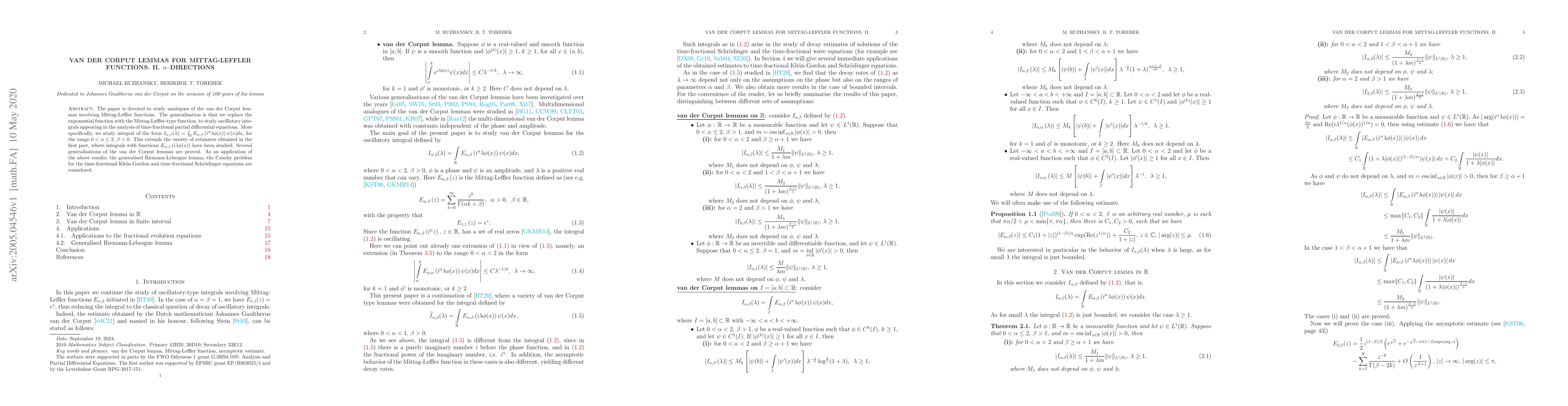 This paper extends van der Corput lemmas to involve Mittag-Leffler functions, studying oscillatory integrals for time-fractional partial differential equations. Generalised results are applied to the generalised Riemann-Lebesgue lemma and the Cauchy problem for time-fractional Klein-Gordon and Schrödinger equations.