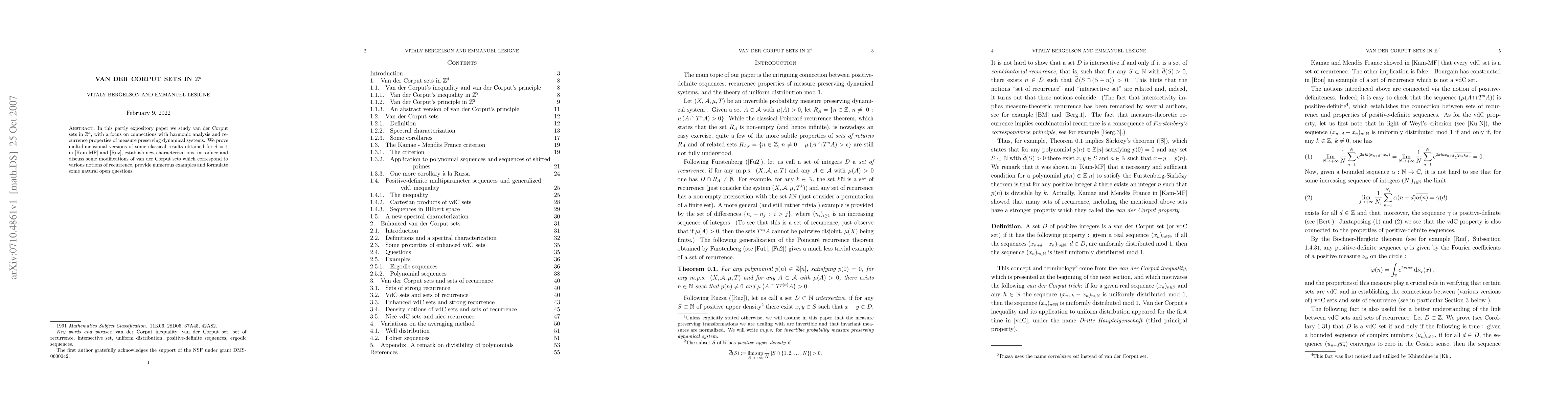 This paper explores van der Corput sets in $\Z^d$, linking them to harmonic analysis and recurrence in measure-preserving dynamical systems. It extends classical results to higher dimensions, introduces new characterizations, and poses several open questions.