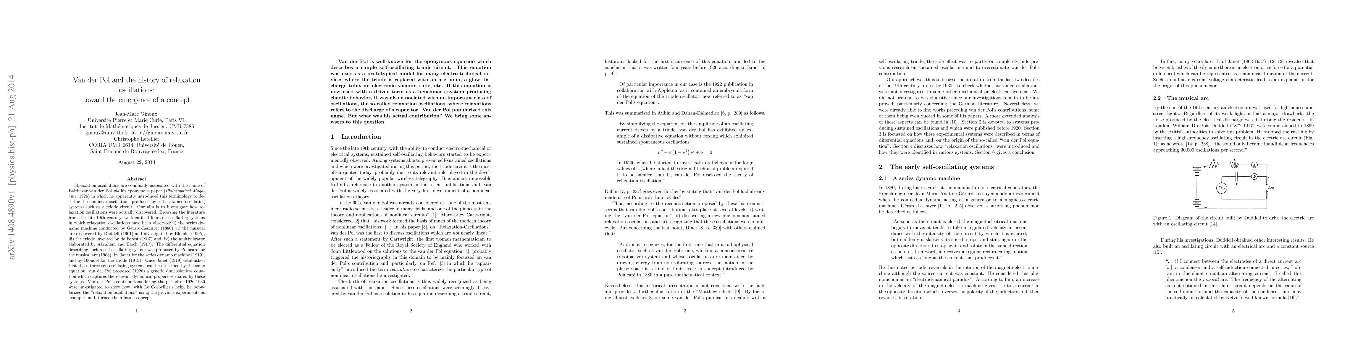This paper explores the historical emergence of the concept of relaxation oscillations, tracing its roots to various self-oscillating systems from the late 19th century, including the series dynamo machine, musical arc, triode, and multivibrator. It highlights van der Pol's pivotal role in popularizing the term and unifying these systems through a generic dimensionless equation.