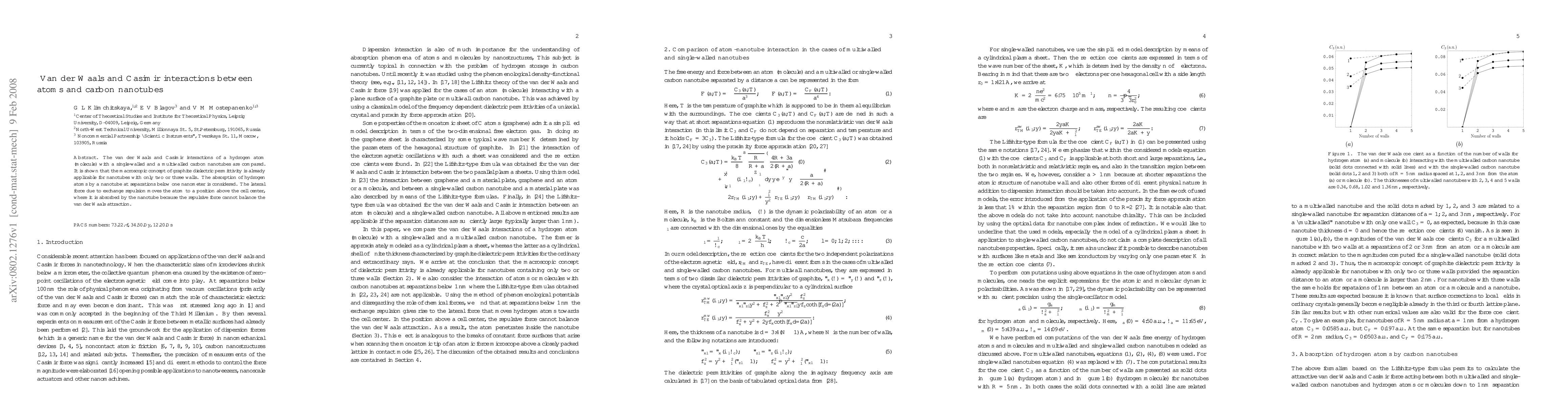 This research compares van der Waals and Casimir interactions between hydrogen atoms and single-walled and multiwalled carbon nanotubes, demonstrating that graphite's macroscopic dielectric permittivity applies to even two- or three-walled nanotubes. It also investigates hydrogen atom absorption by nanotubes, revealing that atoms are drawn into the nanotube due to van der Waals attraction overcoming repulsive forces at sub-nanometer separations.