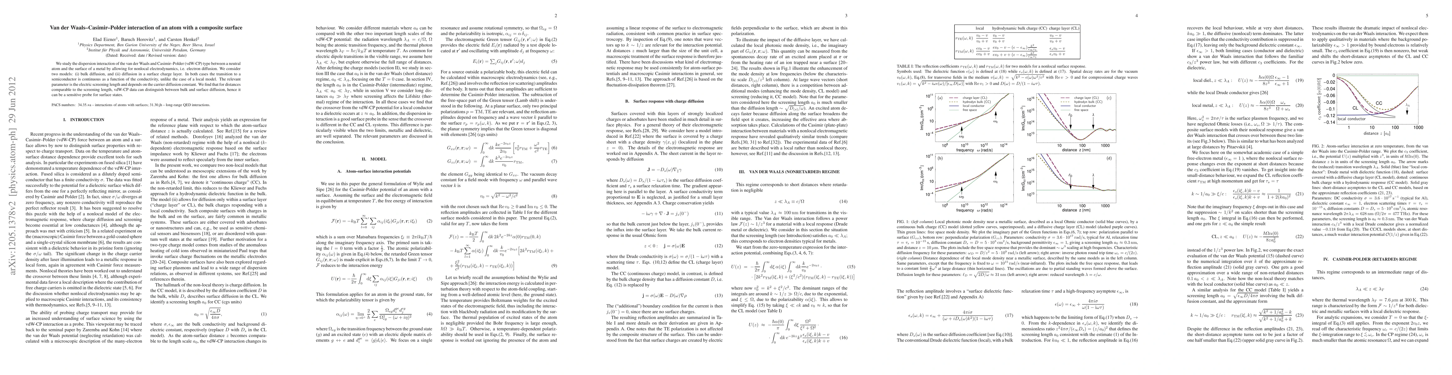 We study the dispersion interaction of the van der Waals and Casimir-Polder (vdW-CP) type between a neutral atom and the surface of a metal by allowing for nonlocal electrodynamics, i.e. electron diffusion. We consider two models: (i) bulk diffusion, and (ii) diffusion in a surface charge layer. In both cases the transition to a semiconductor is continuous as a function of the conductivity, unlike the case of a local model. The relevant parameter is the electric screening length and depends on the carrier diffusion constant. We find that for distances comparable to the screening length, vdW-CP data can distinguish between bulk and surface diffusion, hence it can be a sensitive probe for surface states.