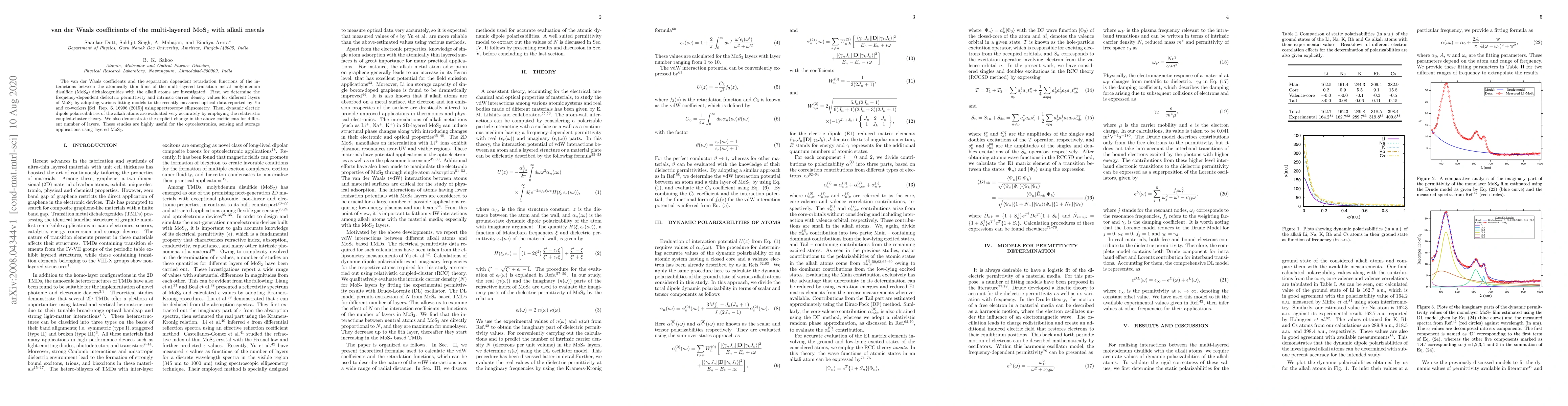 The van der Waals coefficients and the separation dependent retardation functions of the interactions between the atomically thin films of the multi-layered transition metal molybdenum disulfide (MoS$_2$) dichalcogenides with the alkali atoms are investigated. First, we determine the frequency-dependent dielectric permittivity and intrinsic carrier density values for different layers of MoS$_2$ by adopting various fitting models to the recently measured optical data reported by Yu and co-workers [Sci. Rep. {\bf 5}, 16996 (2015)] using spectroscopy ellipsometry. Then, dynamic electric dipole polarizabilities of the alkali atoms are evaluated very accurately by employing the relativistic coupled-cluster theory. We also demonstrate the explicit change in the above coefficients for different number of layers. These studies are highly useful for the optoelectronics, sensing and storage applications using layered MoS$_2$.