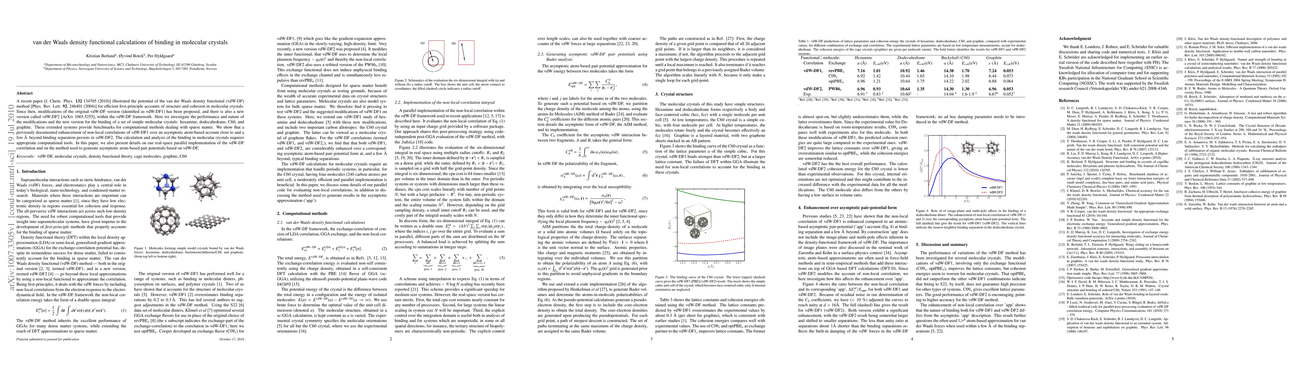 This paper evaluates the performance of the van der Waals density functional (vdW-DF) method, specifically the new vdW-DF2 version, in calculating the binding energies of molecular crystals like hexamine, dodecahedrane, C60, and graphite. It demonstrates that vdW-DF2 maintains the enhanced non-local correlation capabilities of its predecessor, vdW-DF1, and provides details on its real-space parallel implementation.