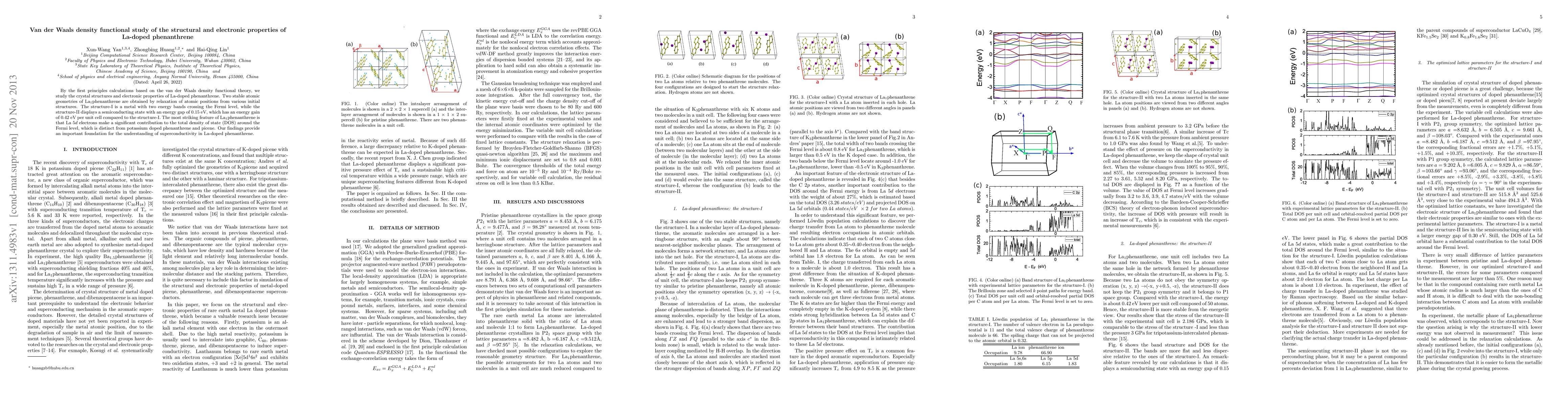 This paper investigates the structural and electronic properties of La-doped phenanthrene using van der Waals density functional theory, identifying two stable configurations. One exhibits metallic behavior, while the other is semiconducting with a 0.15 eV gap, highlighting La $5d$ electrons' unique contribution to the density of states.