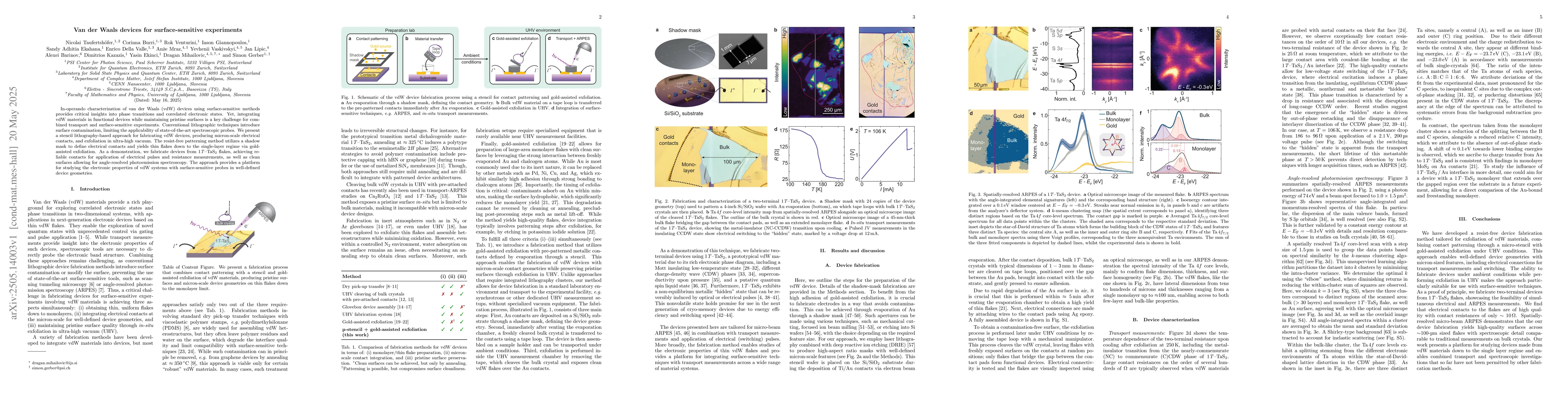 The research employs a stencil lithography-based approach for fabricating van der Waals (vdW) devices, producing micron-scale electrical contacts and thin flakes in ultra-high vacuum without surface contamination. This resist-free patterning method uses a shadow mask to define contacts and gold-assisted exfoliation for obtaining single-layer thin flakes.