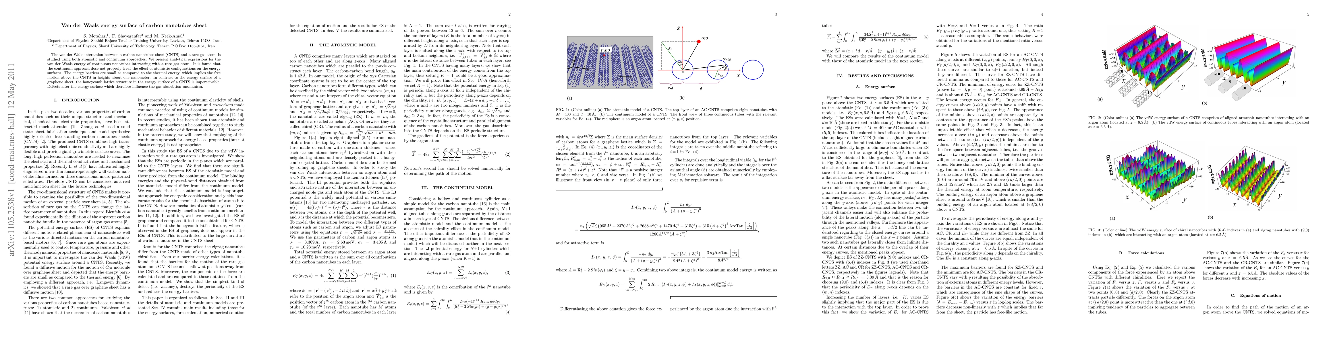 Research studies the van der Waals interaction between carbon nanotubes sheets and rare gas atoms using both atomistic and continuum approaches, finding small energy barriers that allow for free motion above the CNTS.