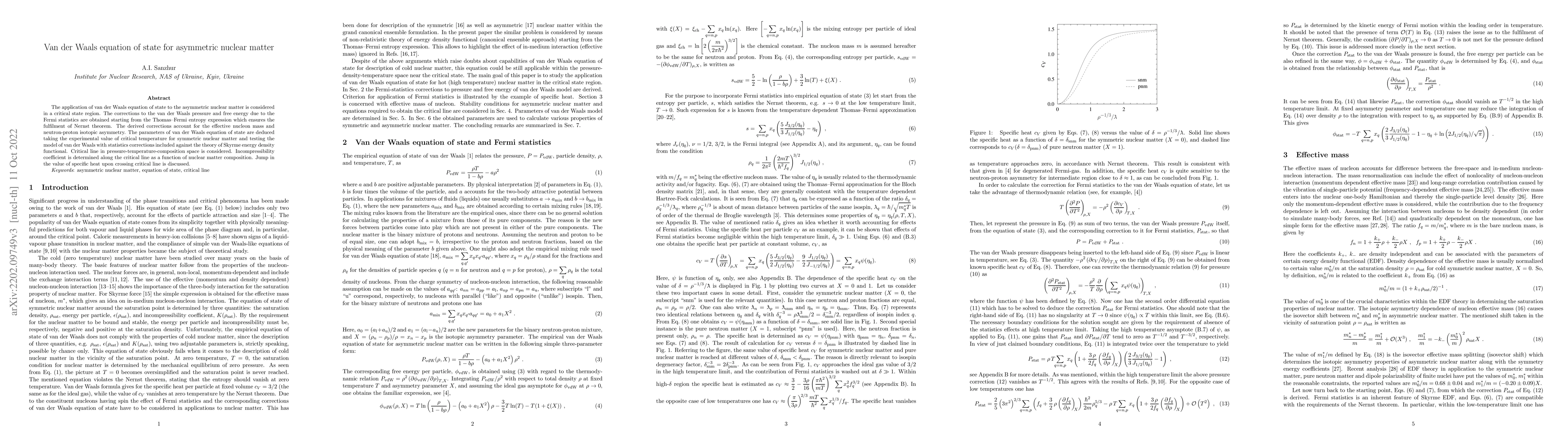 This paper applies the van der Waals equation of state to asymmetric nuclear matter, deriving corrections for Fermi statistics and neutron-proton asymmetry, and deduces model parameters using experimental critical temperature data, testing the model against Skyrme energy density functional and analyzing the incompressibility coefficient and specific heat jump along the critical line.