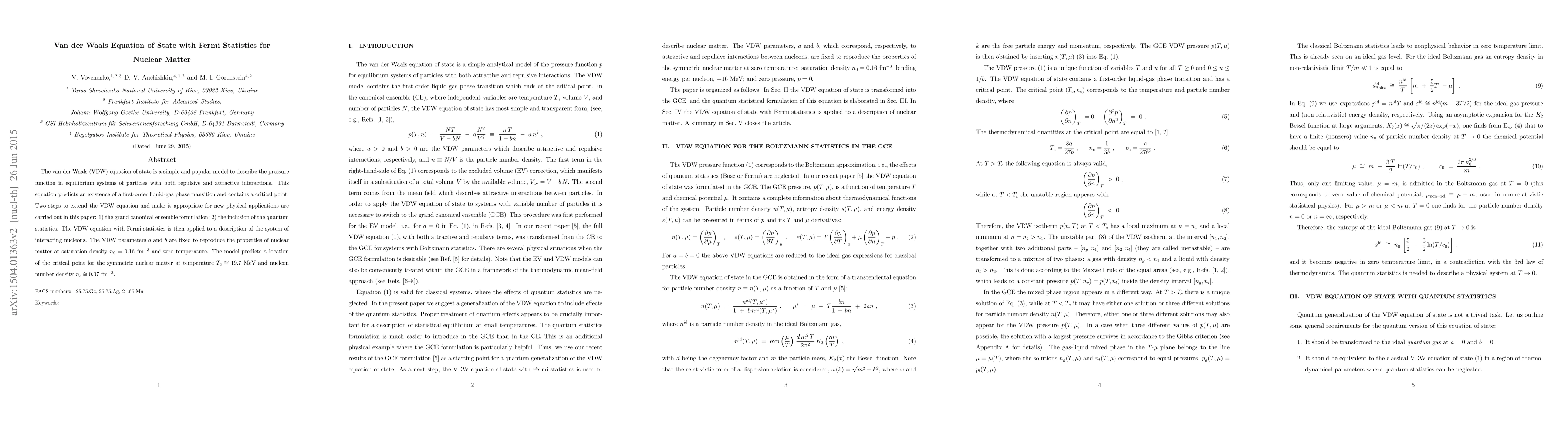 The van der Waals (VDW) equation of state is a simple and popular model to describe the pressure function in equilibrium systems of particles with both repulsive and attractive interactions. This equation predicts an existence of a first-order liquid-gas phase transition and contains a critical point. Two steps to extend the VDW equation and make it appropriate for new physical applications are carried out in this paper: 1) the grand canonical ensemble formulation; 2) an inclusion of the quantum statistics. The VDW equation with Fermi statistics is then applied to a description of the system of interacting nucleons. The VDW parameters $a$ and $b$ are fixed to reproduce the properties of nuclear matter at saturation density $n_0=0.16$ fm$^{-3}$ and zero temperature. The model predicts a location of the critical point for the symmetric nuclear matter at temperature $T_c\cong 19.7$ MeV and nucleon number density $n_c \cong 0.07$ fm$^{-3}$.