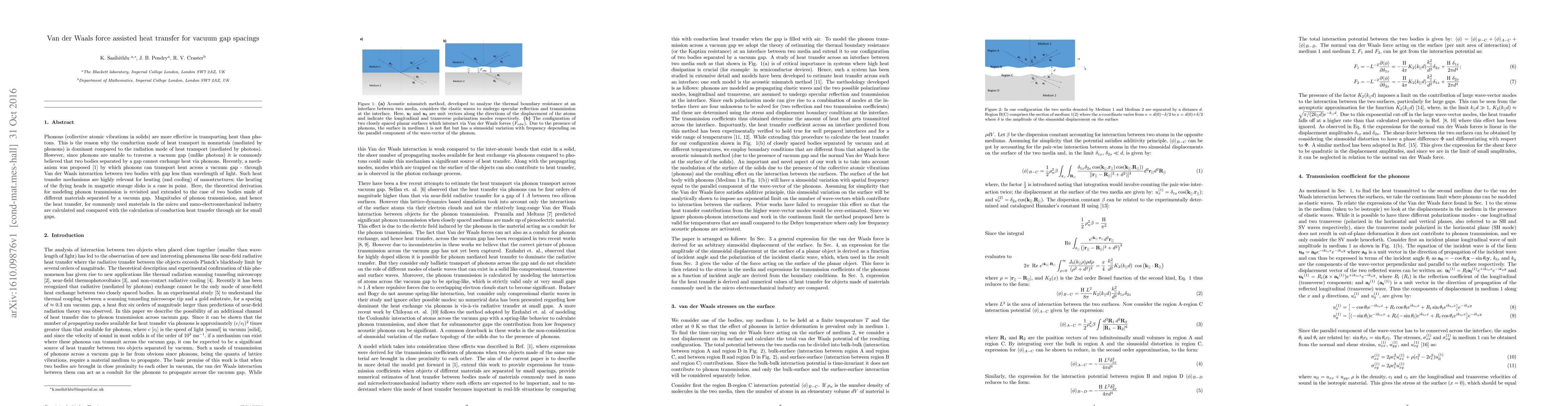 This paper revisits and extends the theoretical model for phonon-based heat transfer across vacuum gaps via Van der Waals forces, demonstrating its relevance for nanostructures and magnetic storage disks. It calculates and compares phonon transmission magnitudes for various materials against conduction heat transfer through air for small gaps.