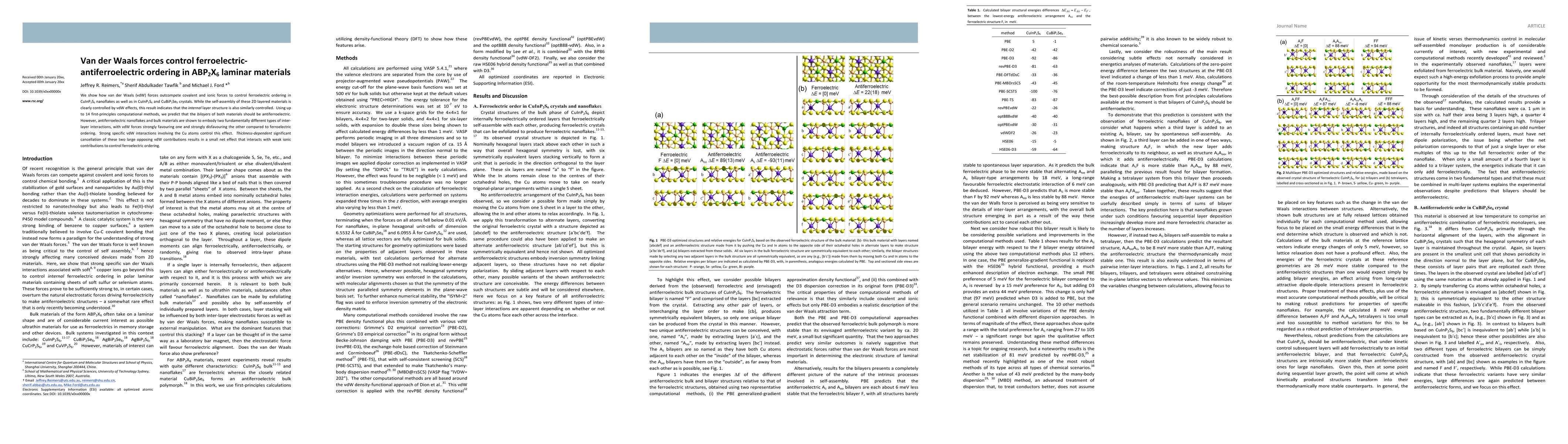 We show how van der Waals (vdW) forces outcompete covalent and ionic forces to control ferroelectric ordering in CuInP2S6 nanoflakes as well as in CuInP2S6 and CuBiP2Se6 crystals. While the self-assembly of these 2D layered materials is clearly controlled by vdW effects, this result indicates that the internal layer structure is also similarly controlled. Using up to 14 first-principles computational methods, we predict that the bilayers of both materials should be antiferroelectric. However, antiferroelectric nanoflakes and bulk materials are shown to embody two fundamentally different types of inter-layer interactions, with vdW forces strongly favouring one and strongly disfavouring the other compared to ferroelectric ordering. Strong specific vdW interactions involving the Cu atoms control this effect. Thickness-dependent significant cancellation of these two large opposing vdW contributions results in a small net effect that interacts with weak ionic contributions to control ferroelectric ordering.