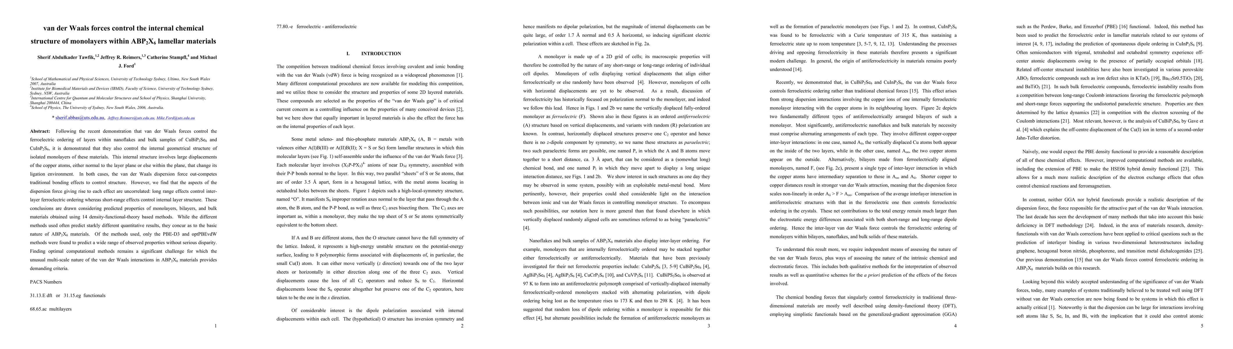 Following the recent demonstration that van der Waals forces control the ferroelectric ordering of layers within nanoflakes and bulk samples of CuBiP2Se6 and CuInP2S6, it is demonstrated that they also control the internal geometrical structure of isolated monolayers of these materials. This internal structure involves large displacements of the copper atoms, either normal to the layer plane or else within the plane, that change its ligation environment. In both cases, the van der Waals dispersion force out-competes traditional bonding effects to control structure. However, we find that the aspects of the dispersion force giving rise to each effect are uncorrelated: long range effects control inter-layer ferroelectric ordering whereas short-range effects control internal layer structure. These conclusions are drawn considering predicted properties of monolayers, bilayers, and bulk materials obtained using 14 density-functional-theory based methods. While the different methods used often predict starkly different quantitative results, they concur as to the basic nature of ABP2X6 materials. Of the methods used, only the PBE-D3 and optPBEvdW methods were found to predict a wide range of observed properties without serious disparity. Finding optimal computational methods remains a significant challenge for which the unusual multi-scale nature of the van der Waals interactions in ABP2X6 materials provides demanding criteria.
