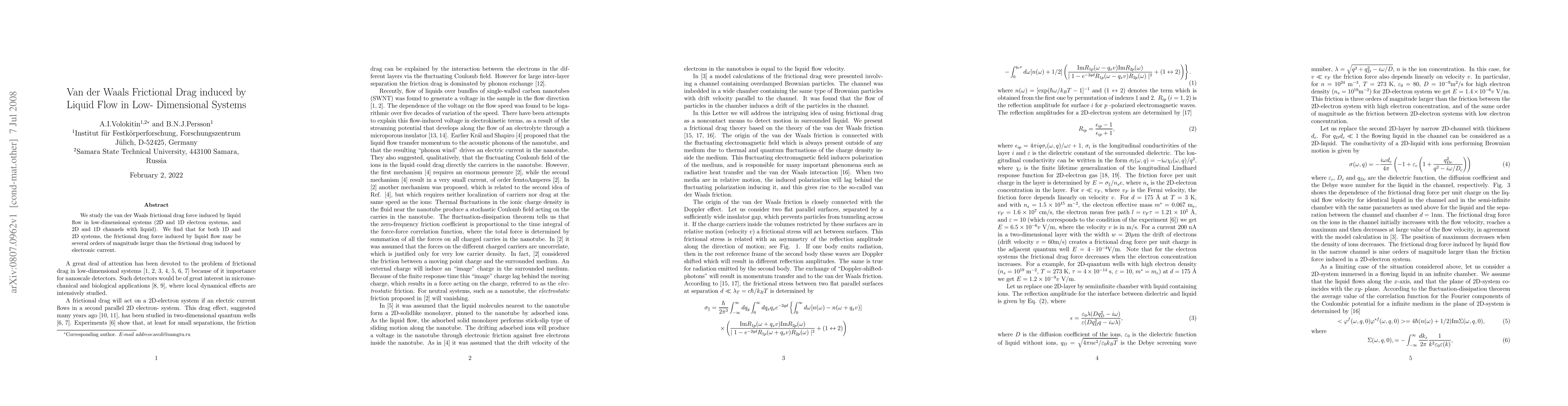Summary: This study investigates the van der Waals frictional drag force in liquid flow through low-dimensional systems, revealing that the drag force from liquid can be significantly larger than that from electronic current, especially in 1D and 2D configurations.