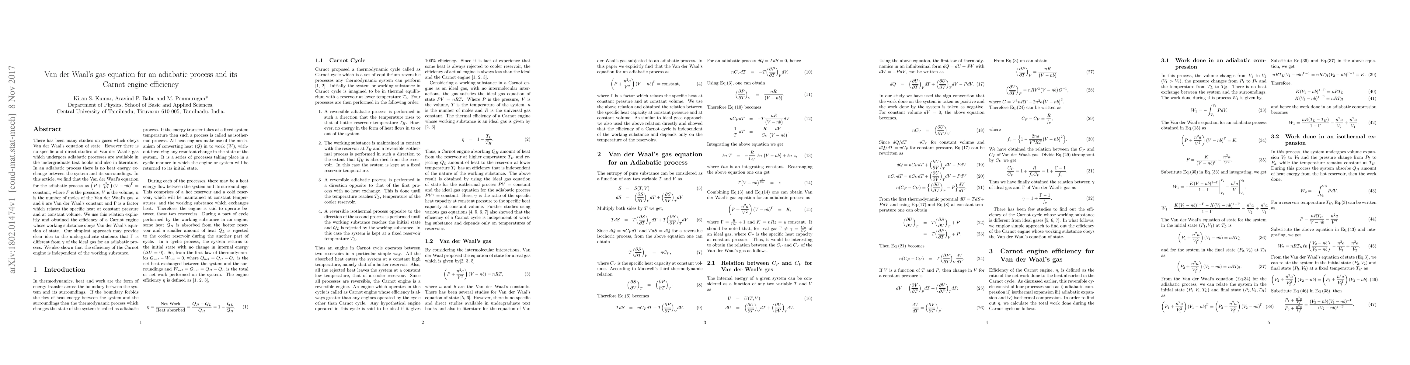 There has been many studies on gases which obeys Van der Waal's equation of state. However there is no specific and direct studies of Van der Waal's gas which undergoes adiabatic processes are available in the undergraduate text books and also in literature. In an adiabatic process there is no heat energy exchange between the system and its surroundings. In this article, we find that the Van der Waal's equation for the adiabatic process as $\left(P+\frac{n^2a}{V^2}\right) \left(V-nb\right)^{\Gamma}=\mbox{constant}$, where $P$ is the pressure, $V$ is the volume, $n$ is the number of moles of the Van der Waal's gas, $a$ and $b$ are Van der Waal's constant and $\Gamma$ is a factor which relates the specific heat at constant pressure and at constant volume. We use this relation explicitly and obtained the efficiency of a Carnot engine whose working substance obeys Van der Waal's equation of state. Our simplest approach may provide clear idea to the undergraduate students that $\Gamma$ is different from $\gamma$ of the ideal gas for an adiabatic process. We also shown that the efficiency of the Carnot engine is independent of the working substance.