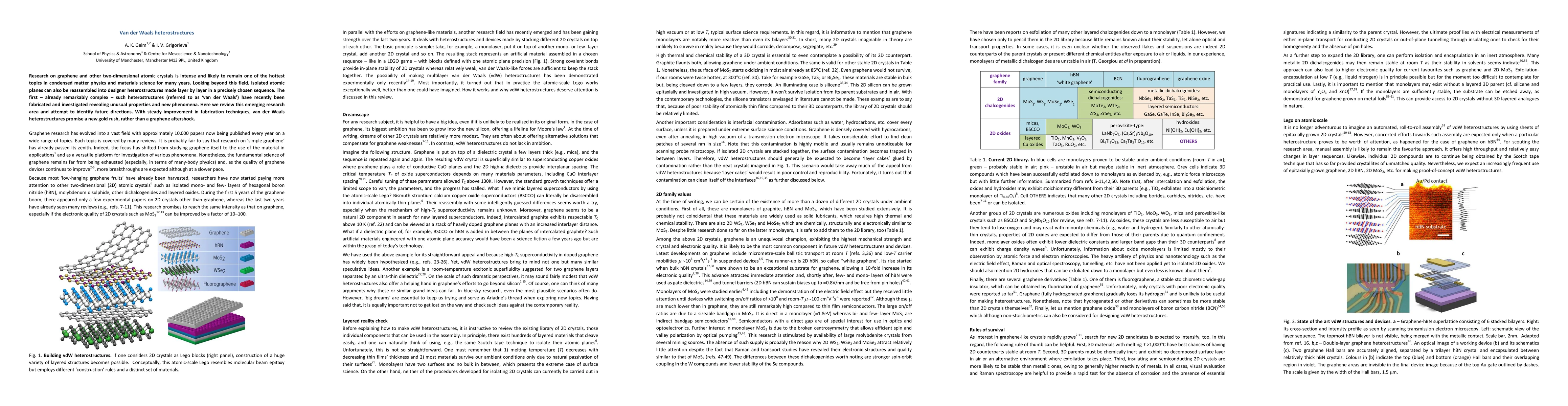 The paper reviews the emerging research area of Van der Waals heterostructures, discussing the fabrication techniques, properties, and potential of these layered structures made from various 2D crystals including graphene, hBN, and metal dichalcogenides.