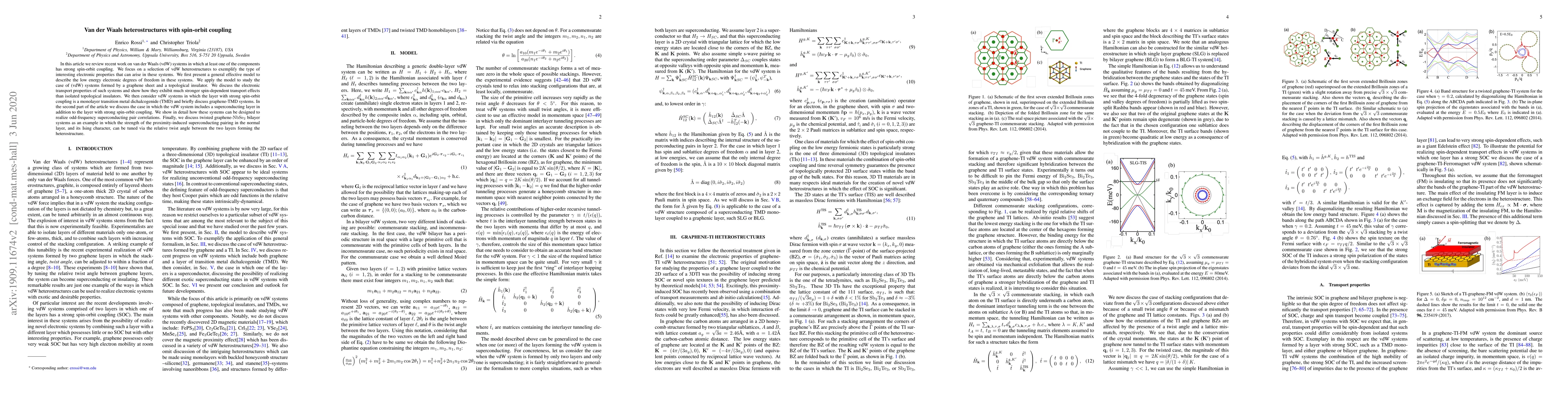 This paper reviews van der Waals heterostructures with strong spin-orbit coupling, emphasizing their unique electronic properties. It presents an effective model to describe low-energy electronic behavior, highlighting stronger spin-dependent transport in graphene-topological insulator systems and exploring superconducting pair correlations in heterostructures with additional superconducting layers.