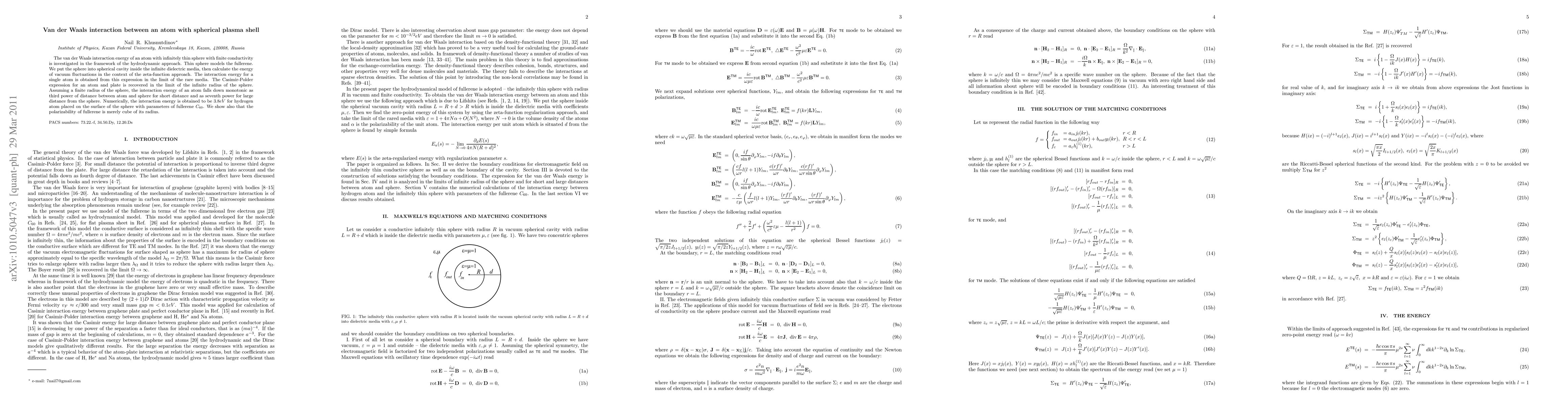 We consider the van der Waals energy of an atom near the infinitely thin sphere with finite conductivity which model the fullerene. We put the sphere into spherical cavity inside the infinite dielectric media, then calculate the energy of vacuum fluctuations in framework of the zeta-function approach. The energy for a single atom is obtained from this expression by consideration of the rare media. In the limit of the infinite radius of the sphere the Casimir-Polder expression for an atom and plate is recovered. For finite radius of sphere the energy of an atom monotonously falls down as $d^{-3}$ close to the sphere and $d^{-7}$ far from the sphere. For hydrogen atom on the surface of the fullerene $C_{60}$ we obtain that the energy is $3.8 eV$. We obtain also that the polarizability of fullerene is merely cube of its radius.