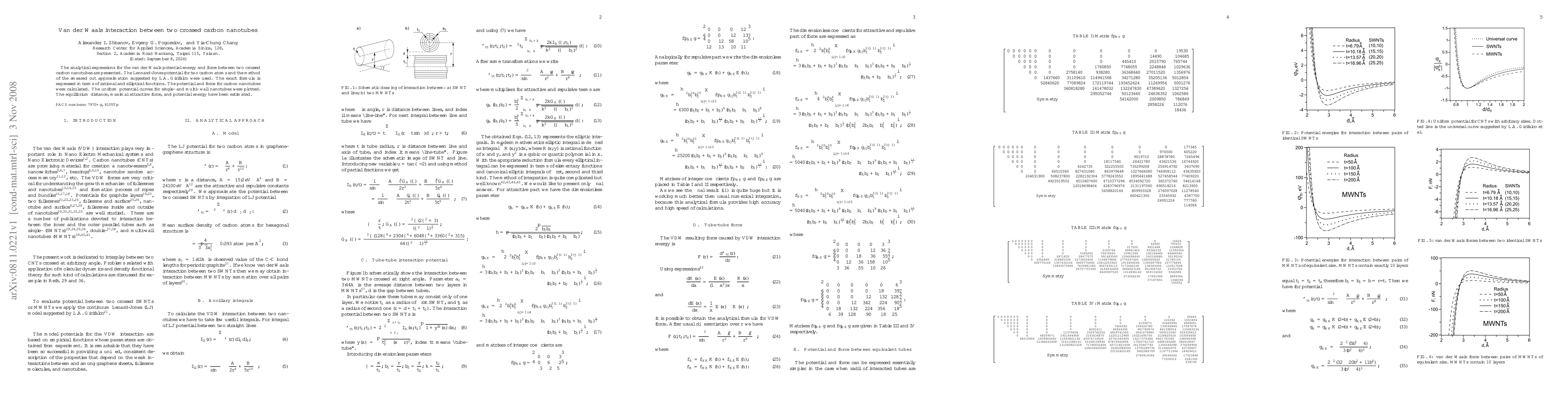 This paper presents analytical expressions for van der Waals interactions between two crossed carbon nanotubes using Lennard-Jones potential and a smeared approximation method, yielding exact formulas in rational and elliptical functions. The study also estimates equilibrium distance, maximal attractive force, and potential energy.