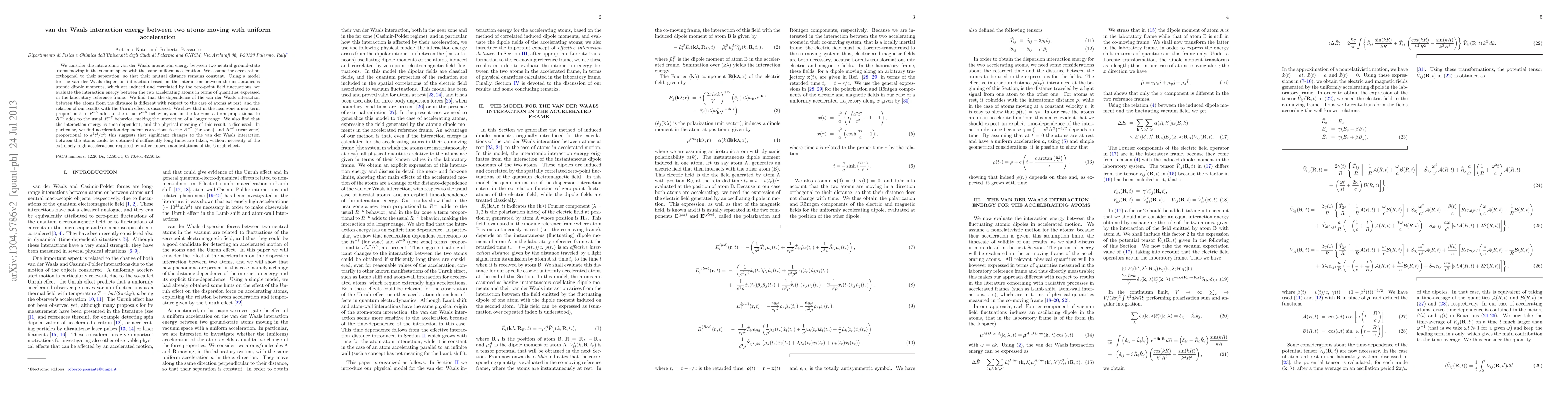 This paper investigates the van der Waals interaction energy between two neutral atoms under uniform acceleration, finding a modified interaction behavior compared to atoms at rest. It reveals new long-range interaction terms and discusses the time-dependent nature of the interaction, suggesting significant effects from moderate acceleration over long durations.