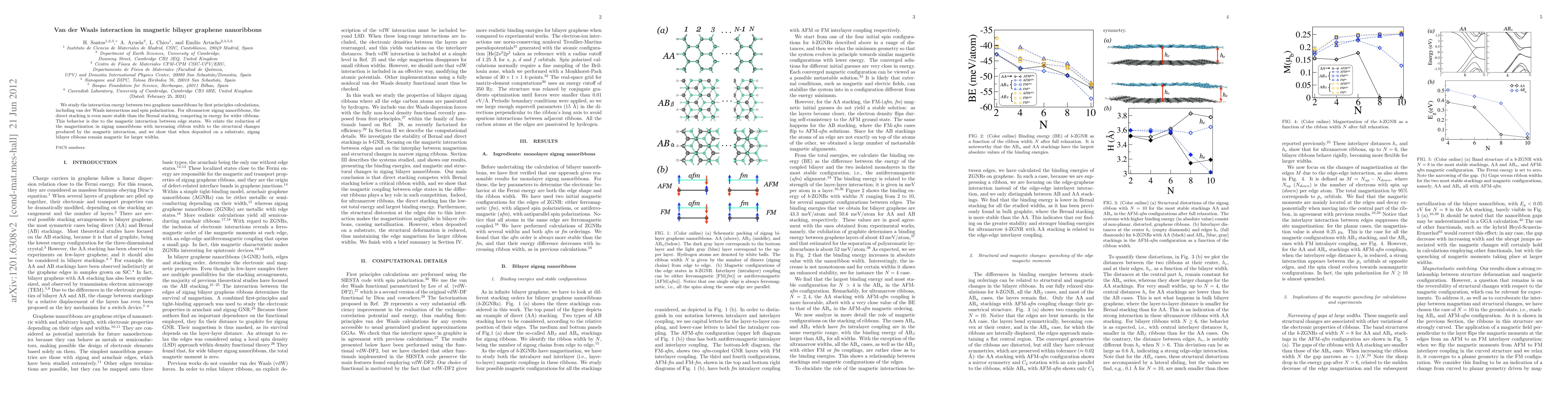 We study the interaction energy between two graphene nanoribbons by first principles calculations, including van der Waals interactions and spin polarization. For ultranarrow zigzag nanoribbons, the direct stacking is even more stable than Bernal, competing in energy for wider ribbons. This behavior is due to the magnetic interaction between edge states. We relate the reduction of the magnetization in zigzag nanoribbons with increasing ribbon width to the structural changes produced by the magnetic interaction, and show that when deposited on a substrate, zigzag bilayer ribbons remain magnetic for larger widths.