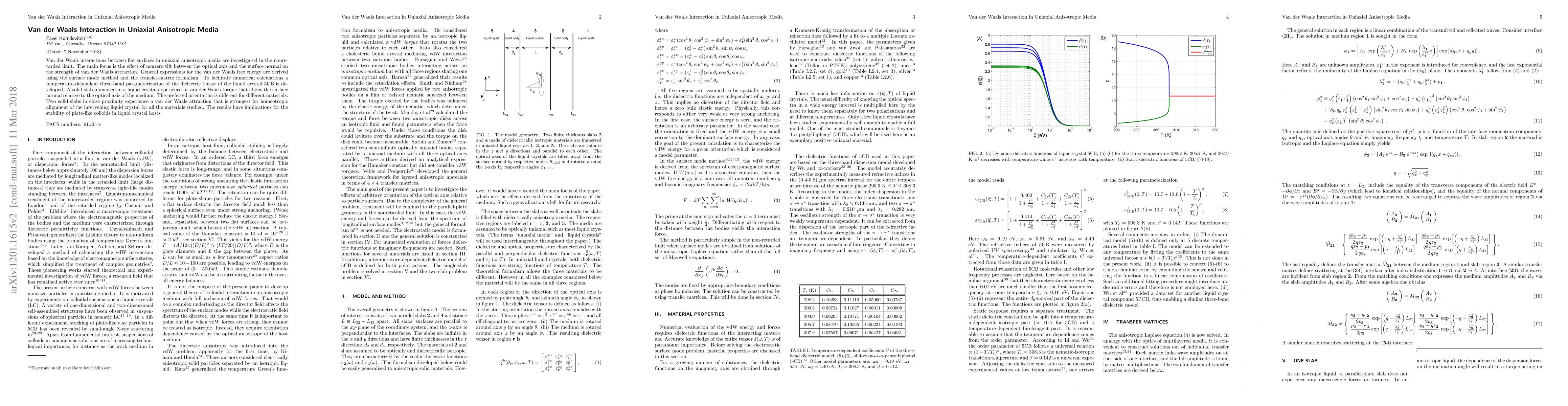 This research investigates van der Waals interactions in uniaxial anisotropic media, deriving expressions for the free energy and torque effects, and finding that solid slabs experience attraction and alignment torques depending on the tilt of the optical axis relative to the surface normal, with implications for colloidal stability in liquid crystal environments.