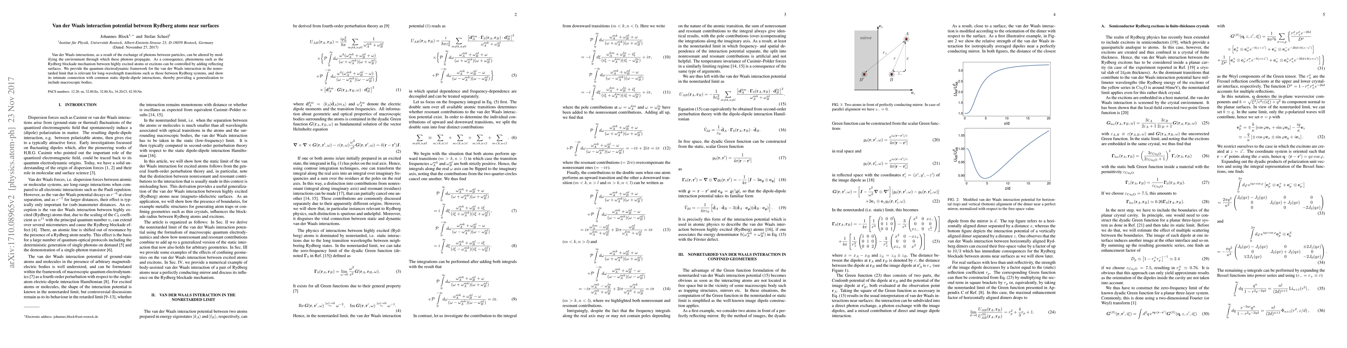 This paper develops a quantum electrodynamic model for van der Waals interactions between Rydberg atoms near surfaces, demonstrating how modifying the environment alters these interactions and explaining their relation to static dipole-dipole interactions, with implications for controlling Rydberg blockade mechanisms.