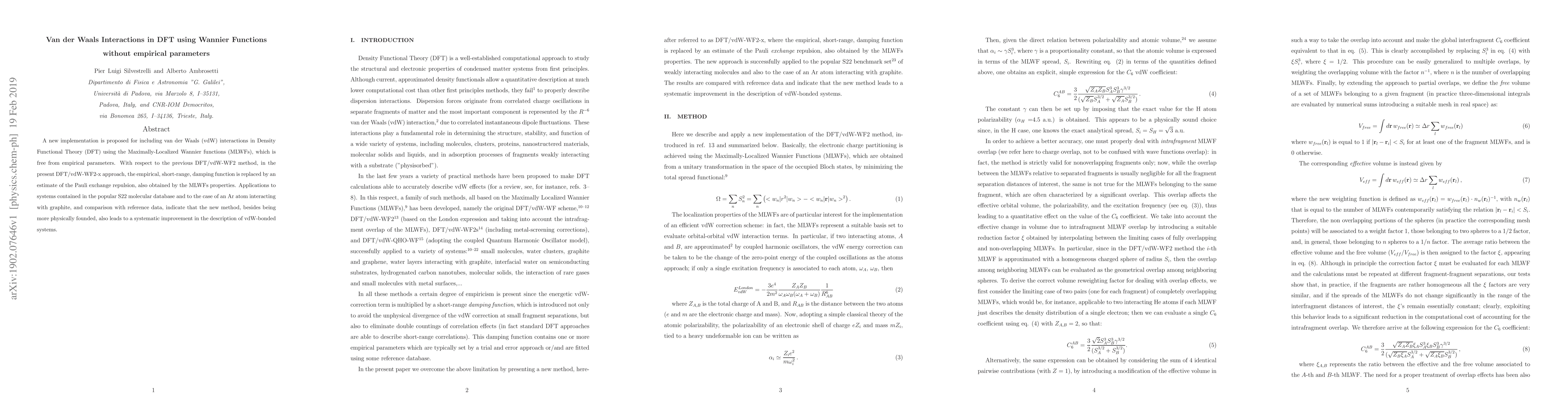 This paper introduces a new method for incorporating van der Waals interactions in DFT using Maximally-Localized Wannier functions, eliminating the need for empirical parameters. The new DFT/vdW-WF2-x approach replaces the empirical damping function with an estimate of Pauli exchange repulsion, showing improved accuracy in describing vdW-bonded systems.