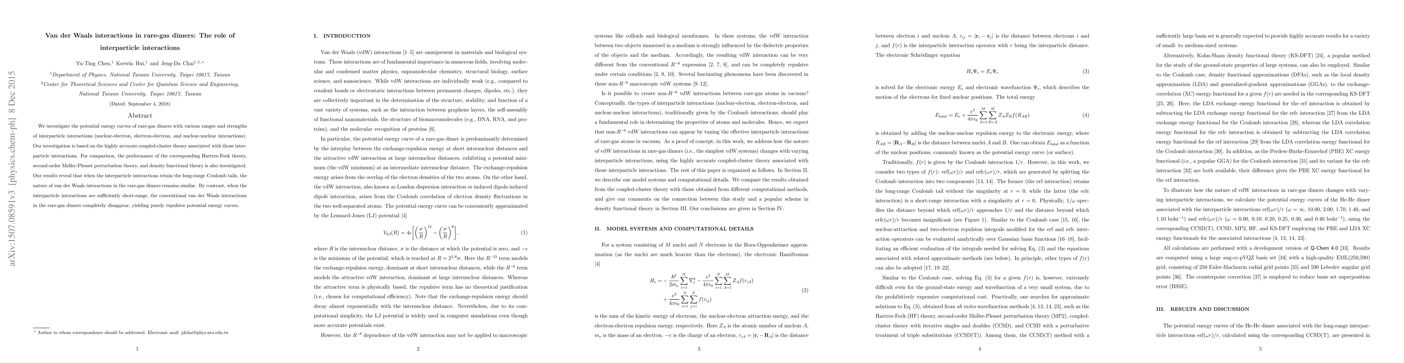 This paper examines the potential energy curves of rare-gas dimers using coupled-cluster theory, revealing that long-range Coulomb interactions maintain van der Waals behavior, while short-range interactions lead to purely repulsive potentials. Comparisons with Hartree-Fock, MP2, and DFT methods highlight the significance of interparticle interactions in determining the nature of van der Waals forces.