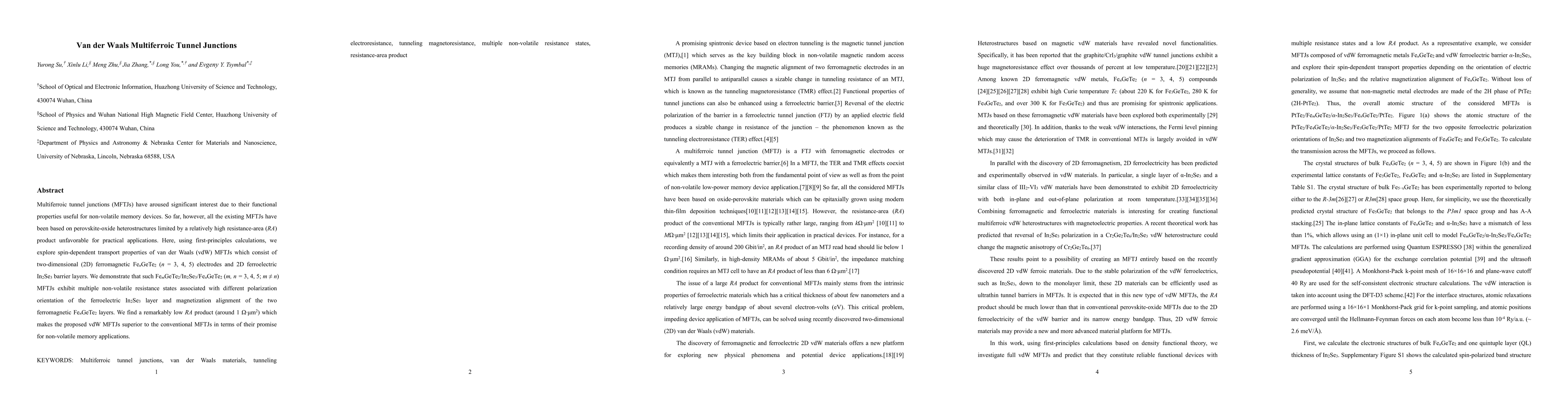 This paper explores van der Waals multiferroic tunnel junctions (MFTJs) composed of 2D ferromagnetic FenGeTe2 and ferroelectric In2Se3 layers, demonstrating low resistance-area products and multiple non-volatile resistance states, suggesting superior performance for non-volatile memory applications compared to conventional perovskite-based MFTJs.