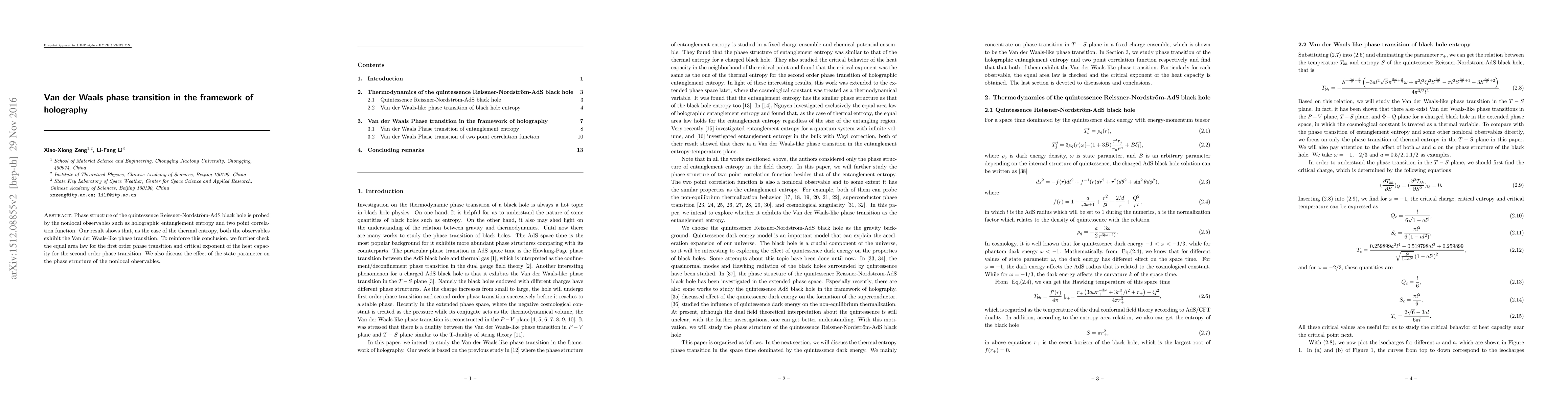 This research paper investigates a Van der Waals phase transition in black holes using holographic entanglement entropy and two-point correlation functions, finding similar behavior to thermal entropy.