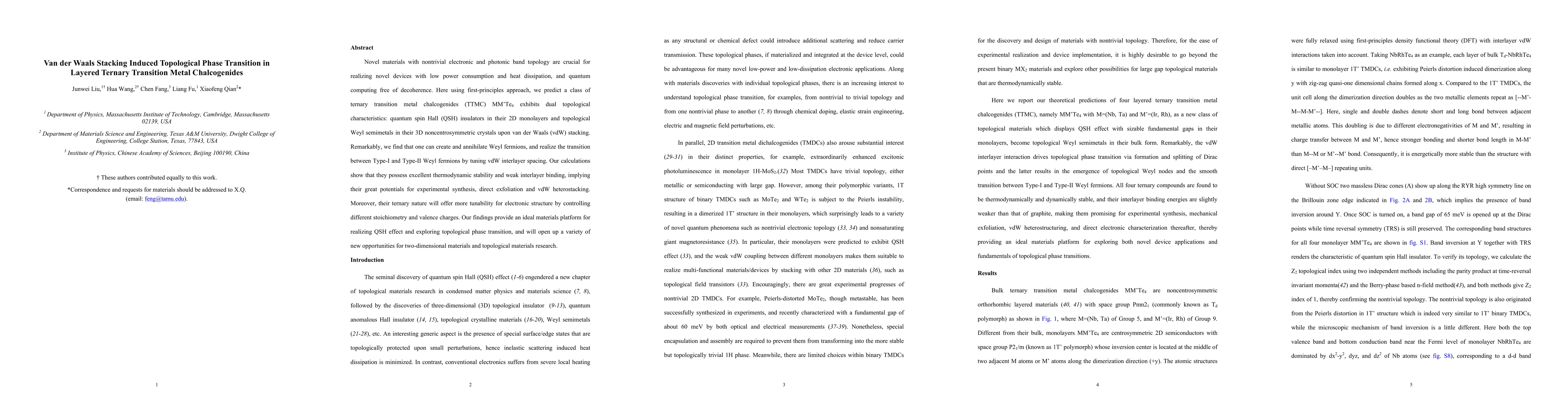 Novel materials with nontrivial electronic and photonic band topology are crucial for realizing novel devices with low power consumption and heat dissipation, and quantum computing free of decoherence. Here using first-principles approach, we predict a class of ternary transition metal chalcogenides (TTMC) MM'Te$_4$ exhibits dual topological characteristics: quantum spin Hall (QSH) insulators in their 2D monolayers and topological Weyl semimetals in their 3D noncentrosymmetric crystals upon van der Waals (vdW) stacking. Remarkably, we find that one can create and annihilate Weyl fermions, and realize the transition between Type-I and Type-II Weyl fermions by tuning vdW interlayer spacing. Our calculations show that they possess excellent thermodynamic stability and weak interlayer binding, implying their great potentials for experimental synthesis, direct exfoliation and vdW heterostacking. Moreover, their ternary nature will offer more tunability for electronic structure by controlling different stoichiometry and valence charges. Our findings provide an ideal materials platform for realizing QSH effect and exploring topological phase transition, and will open up a variety of new opportunities for two-dimensional materials and topological materials research.