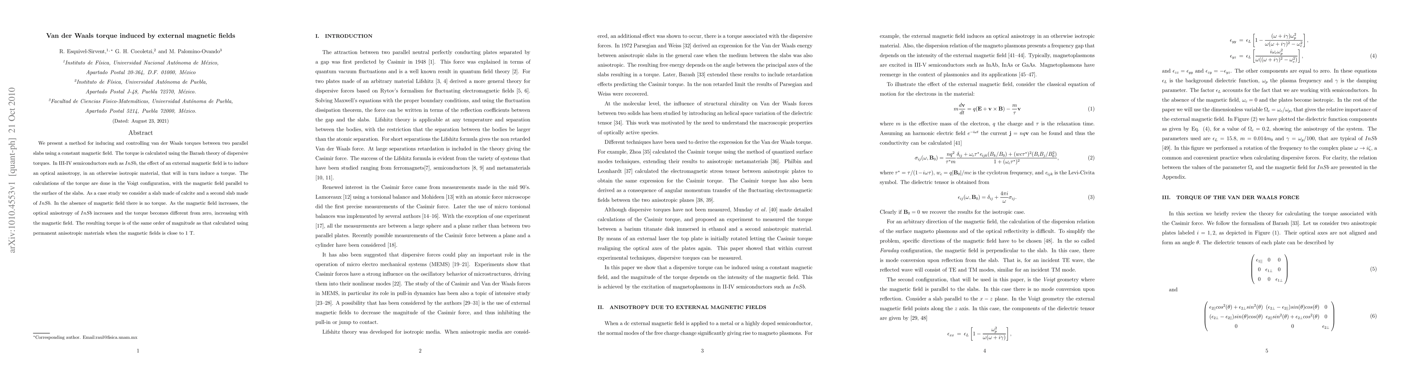 We present a method for inducing and controlling van der Waals torques between two parallel slabs using a constant magnetic field. The torque is calculated using the Barash theory of dispersive torques. In III-IV semiconductors such as $InSb$, the effect of an external magnetic field is to induce an optical anisotropy, in an otherwise isotropic material, that will in turn induce a torque. The calculations of the torque are done in the Voigt configuration, with the magnetic field parallel to the surface of the slabs. As a case study we consider a slab made of calcite and a second slab made of $InSb$. In the absence of magnetic field there is no torque. As the magnetic field increases, the optical anisotropy of $InSb$ increases and the torque becomes different from zero, increasing with the magnetic field. The resulting torque is of the same order of magnitude as that calculated using permanent anisotropic materials when the magnetic fields is close to 1 T.